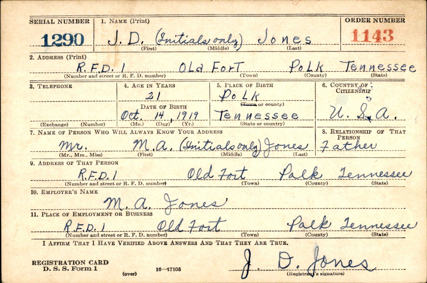 James registered on the 16th of October 1940 when he lived in Old Fort, Polk County, Tennessee and enlisted at Fort Ogethorpe, Georgia the 8th of June 1942. He served in the Army Co. C, 323 Inf., 81 Inf, Div. during World War II. He was not married.