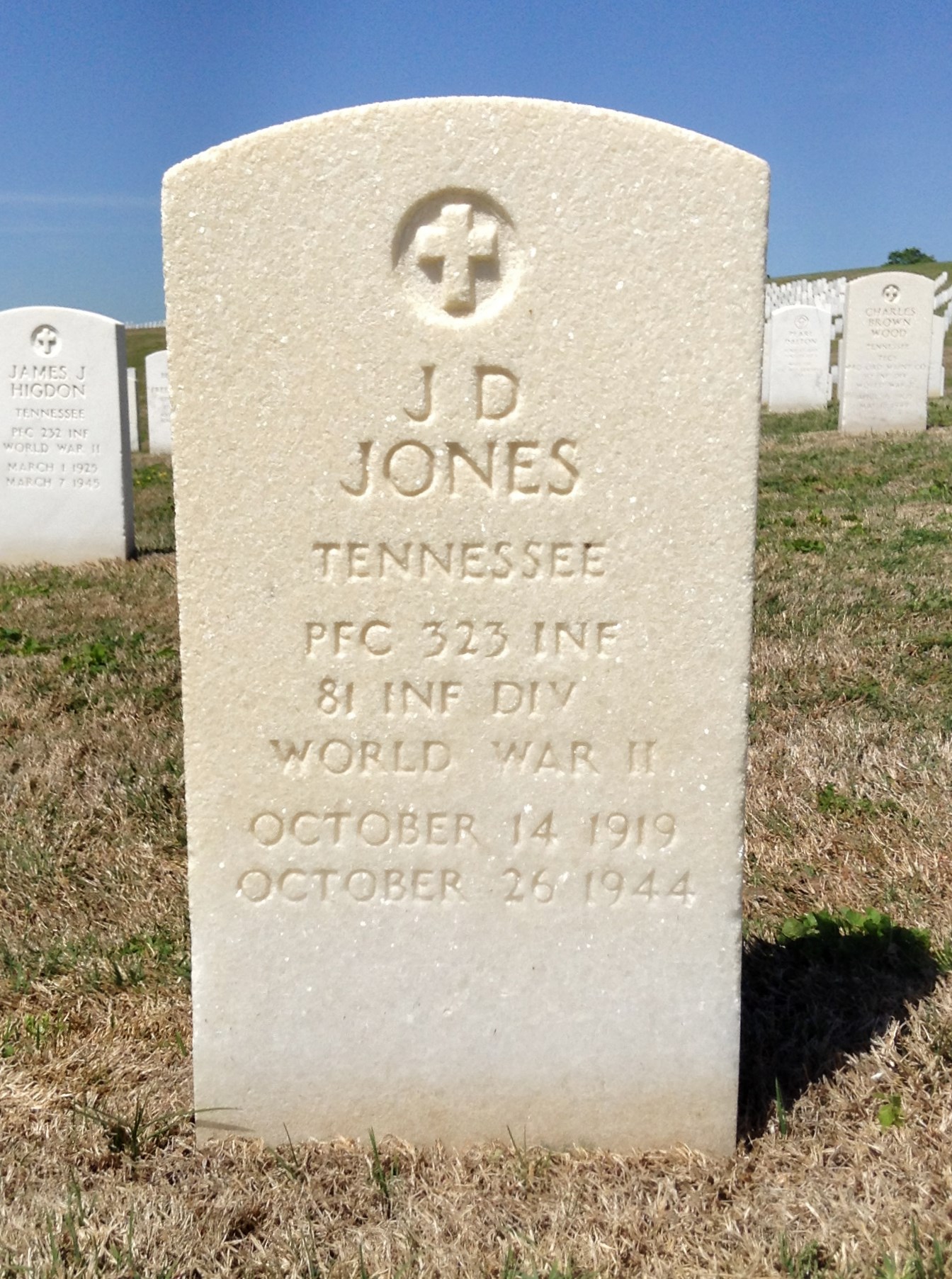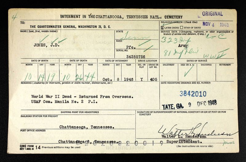Buried at Chattanooga National Cemetery, Y, 405. PFC Jones was initially buried at the USAF Cemetery Manila No. 2 P.I.