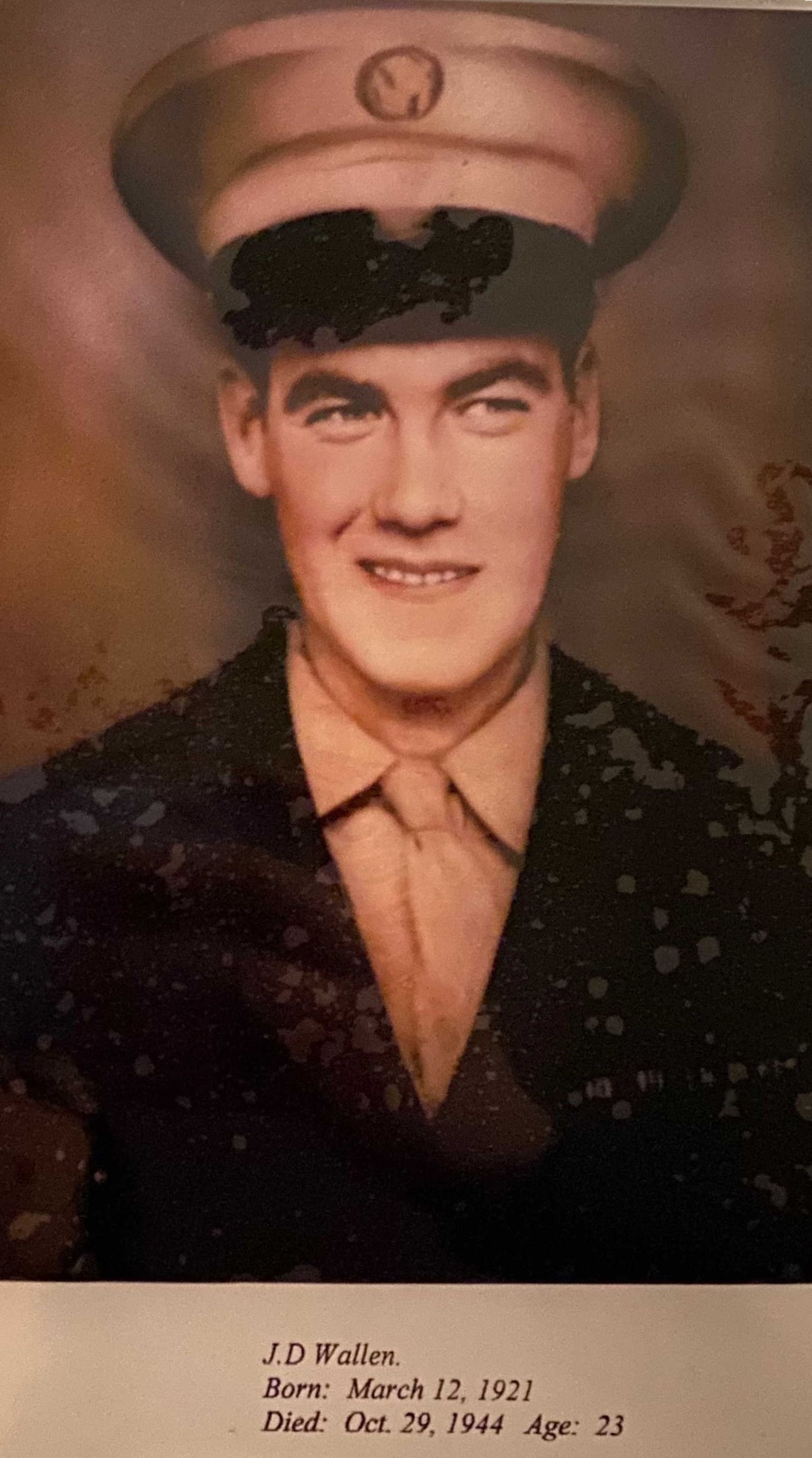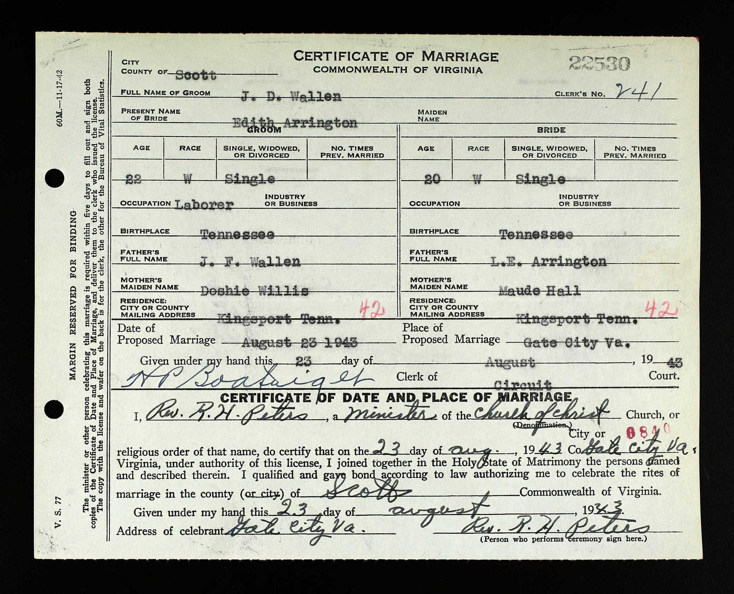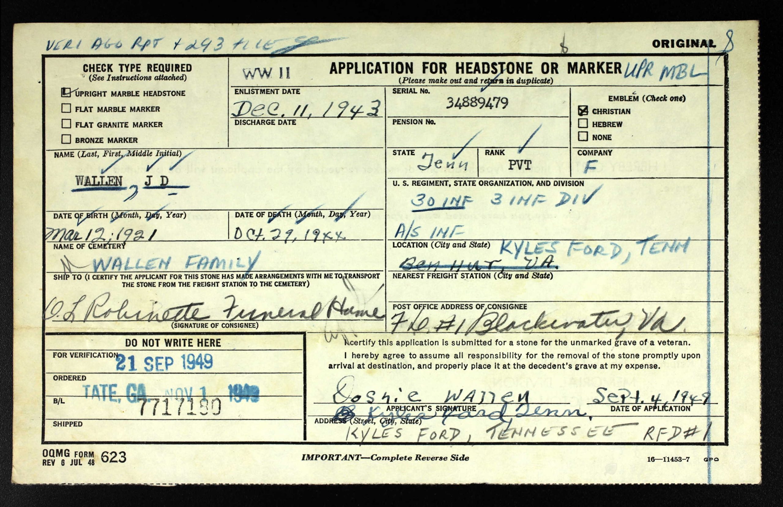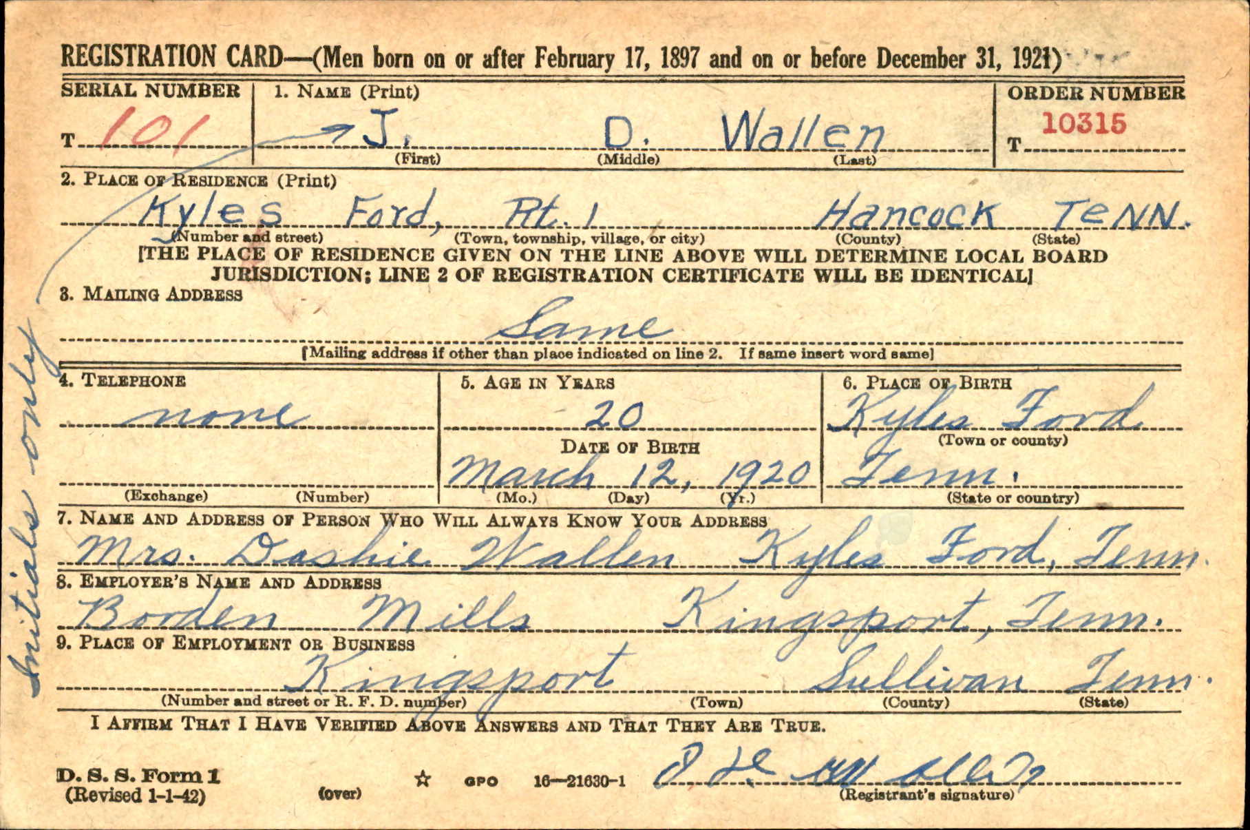 J.D. Wallen was born on 12 March 1921 at Kyles Ford, Tennessee, the son of James Franklin “Jimmie”Wallen and Theodosia “Doshia” Rebecca Willis. He married Edith Arrington at Gate, Virginia on 23 August 1943.
