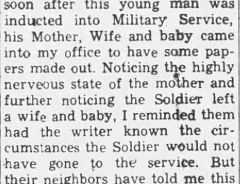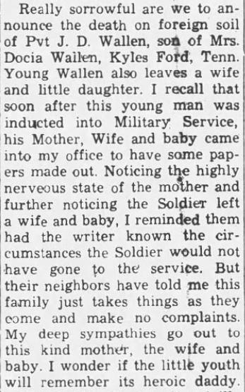 Really sorrowful are we to announce the death on foreighn soil of Pvt. J.D. Wallen, son of Mrs. Docia Wallen, Kyles Ford, Tenn. Young Wallen also leaves a wife and little daughter. I recall that soon after this young man was inducted into Military Service, his mother, wife and baby came into my office to have some papers made out. Noticing the highly nerveous state of the mother and further noticing the Soldier left a wife and baby, I reminded them had the writer known the circumstances the Soldier would not have gone to the service. But their neighbors have told me this family just takes things as they come and make no complaints. My deep sympathies go out to this kind mother, the wife and baby. I wonder if the little youth will remember its heroic Daddy.