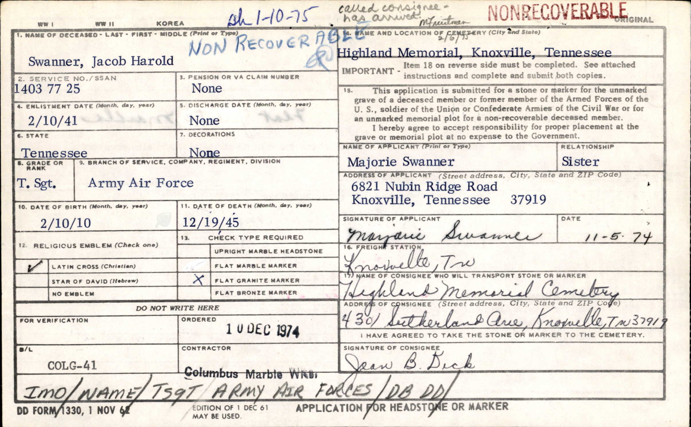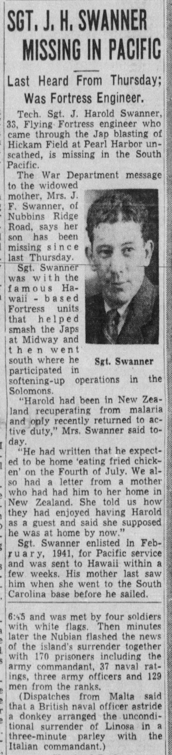 Tech. Sgt. J. Harold Swanner, 33, Flying Fortress engineer who came through the Jap blasting of Hickam Field at Pearl Harbo unscratched, is missing in the South Pacific. The War Departent message to the widowed mother, Mrs. J.F. Swanner, of Nubbins Ridge Road, says her son has been missing since last Thursday. Sgt. Swanner was with the famous Hawaii – based Fortress units that helped smash the Japs at Midway and then went south where he participated in softening-up operations in the Solomons. “Harold had been in New Zealand recuerating from malaria and only recently returned to active duty,” Mrs. Swanner said today. “He had written that he expected to be home ‘eating fired chicken’ on the Fourth of July. We also had a letter from a mother who had had him to her home in New Zealand. She told us how they had enjoyed having Harold as a guest and said she supposed he was at home by now.”