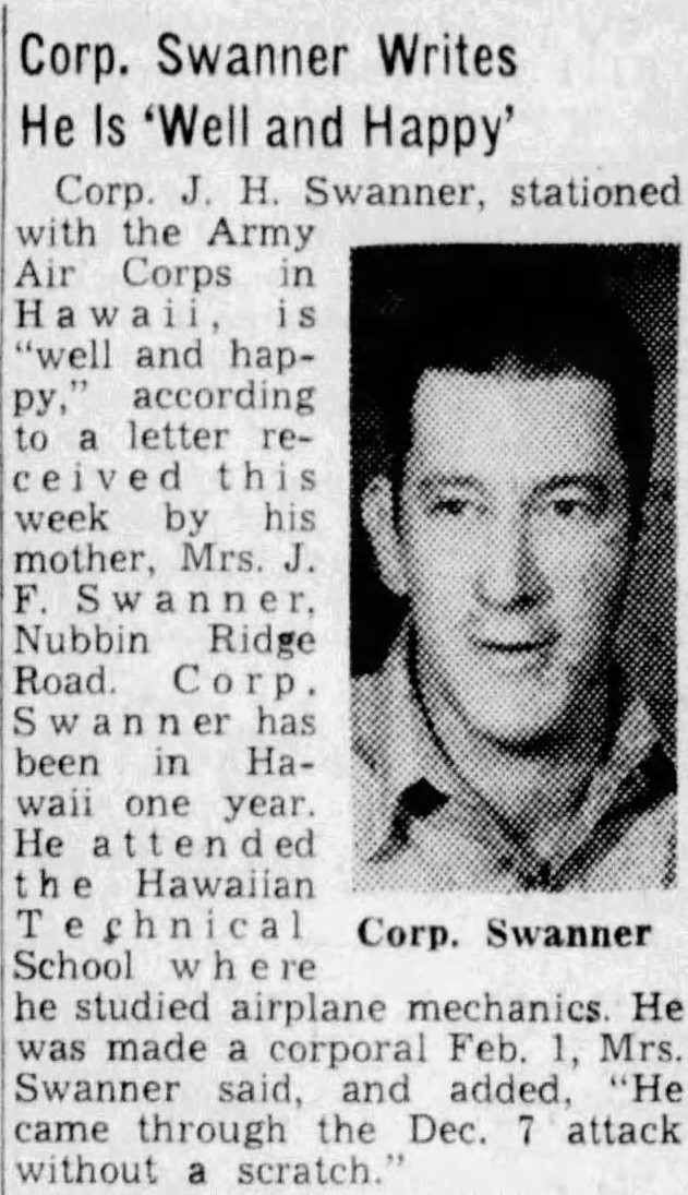 Corpl. J.H. Swanner, stationed with the Army Air Corps in Hawaii is “well and happy,” acording to a letter received this week by his mother, Mrs. J.F. Swanner, Nubbin Ridge Road. Corp. Swanner has been in Hawaii one year. He attended the Hawaiian Technical School where he studied airplane mechanics. He was made a corporal Feb. 1, Mrs. Swanner said, and added “He came through the Dec. 7 attack without a scratch.”