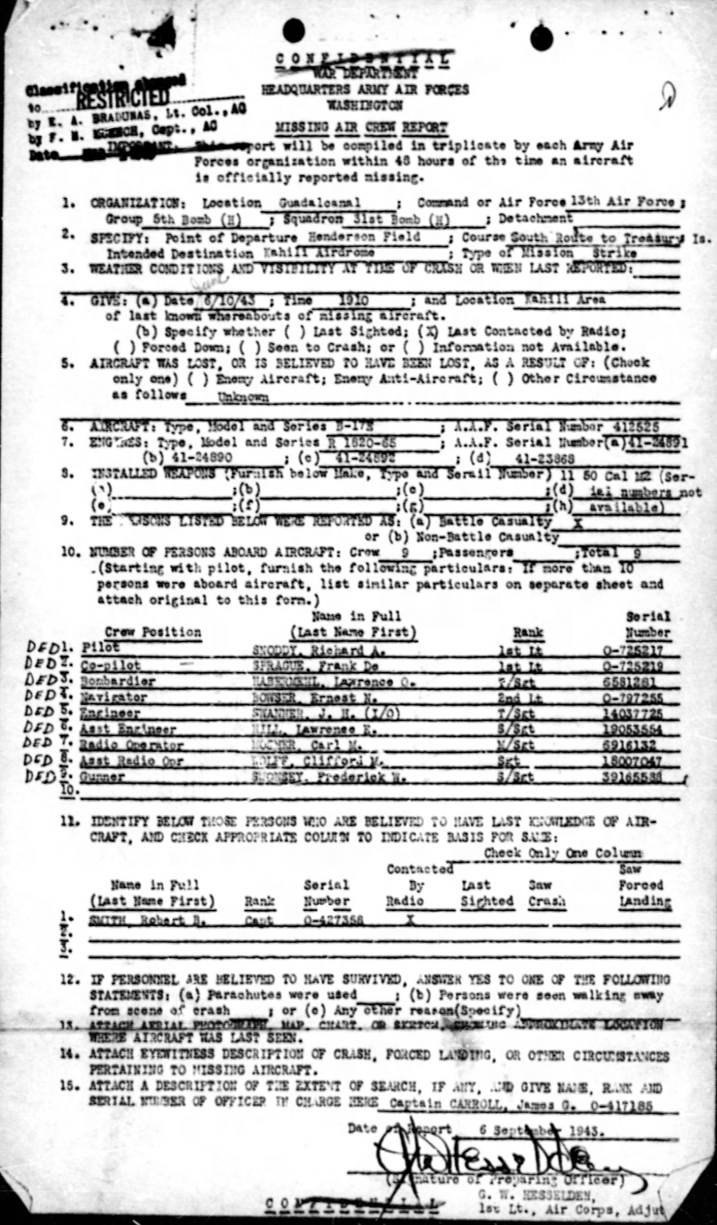 Search for this missing crew was made on 11 June 1943 by three 31st Bomb Sq (H) planes led by Captain Carroll. Results were negative. Several Navy planes also searched and results were also negative.