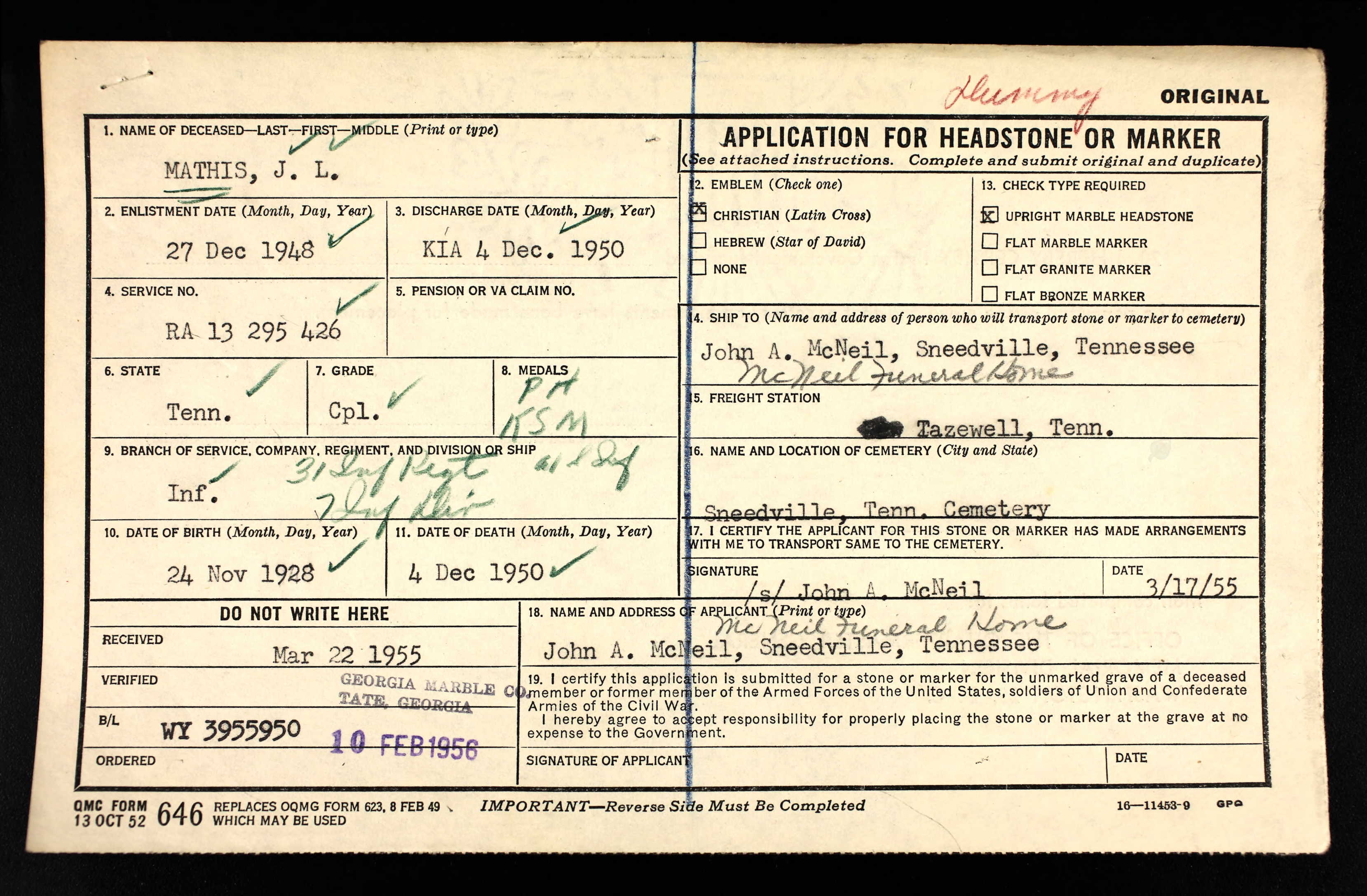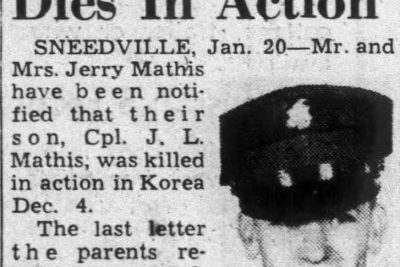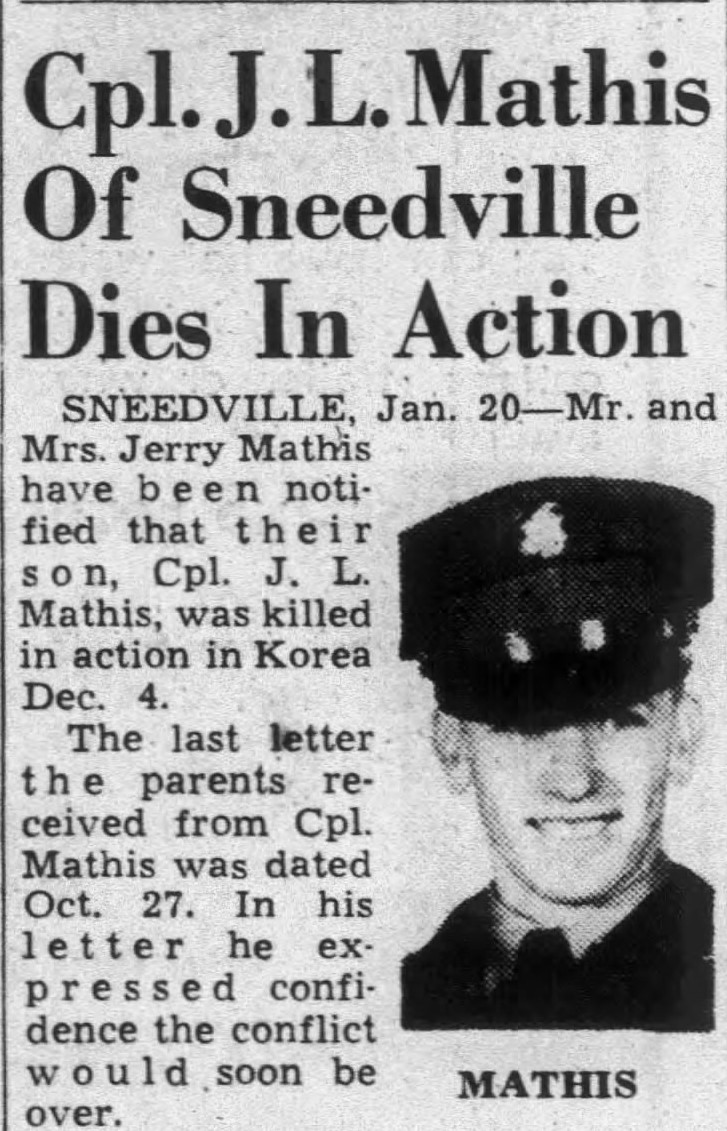 Sneedville, Jan. 20 – Mr. and Mrs. Jerry Mathis have been notified that their son, Cpl. J.L. Mathis, was killed in action in Korea, Dec. 4. The last letter the parents received from Cpl. Mathis was dated Oct. 27. In his letter he expressed confidence the conflict would soon be over.