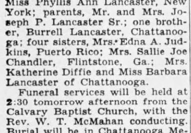 He was survived by a daughter, Miss Phyllis Ann Lancaster, New York; parents and one brother, Burrell Lancaster, Chattanooga; four sisters, Mrs. Edna A. Judkins, Puerto Rico; Mrs. Sallie Joe Chandler, Flintstone, Ga.; Mrs. Katherine Diffie and Miss Barbara Lancaster of Chattanooga.