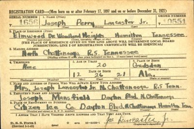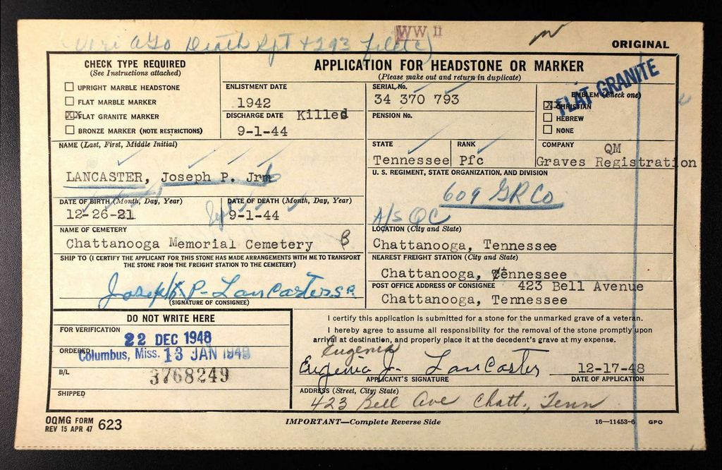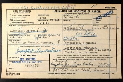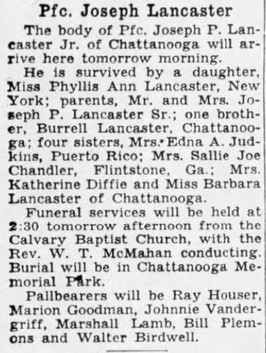 Pfc. Joseph P. Lancaster Jr., 21, son of Mr. and Mrs. J.P. Lancaster, 423 Bell Avenue, was killed in action in France Sept. 1, according to military information received by his parents. He volunteered for army service prior to the Pearl Harbor attack and went overseas three months ago, where he served with the quartermaster corps in the graves registration secton. A former student at G. Russell Brown School and Northside Junior High School, Pfc. Lancaster was formerly employed by the Tennessee Paper Mills in Chattanooga.