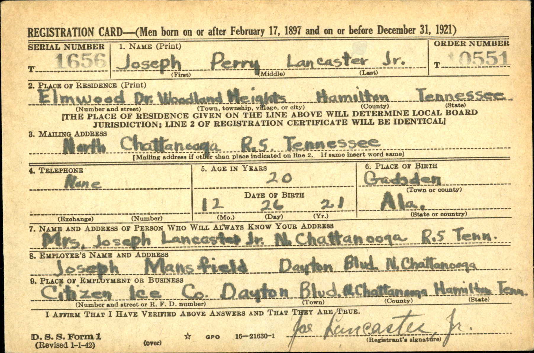 Joseph Perry Lancaster Jr. was born on 26 December 1921 at Gadsden, Alabama, the son of Joseph Perry Lancaster Sr. and Eugenia Johnson.