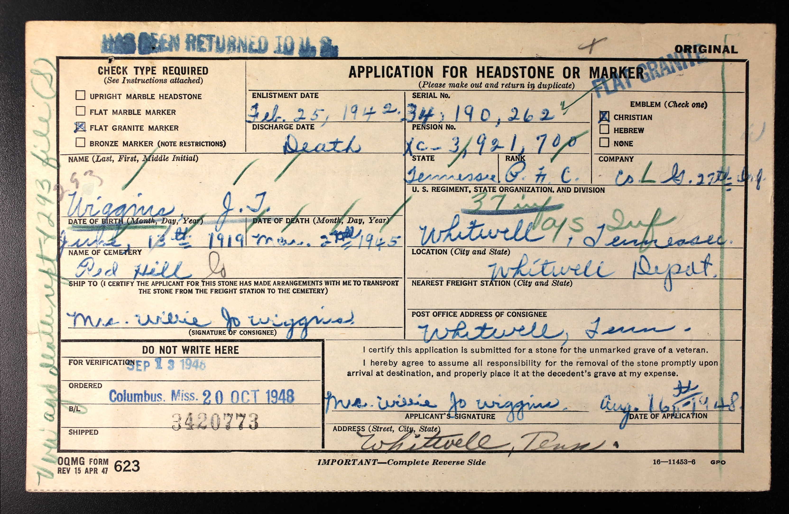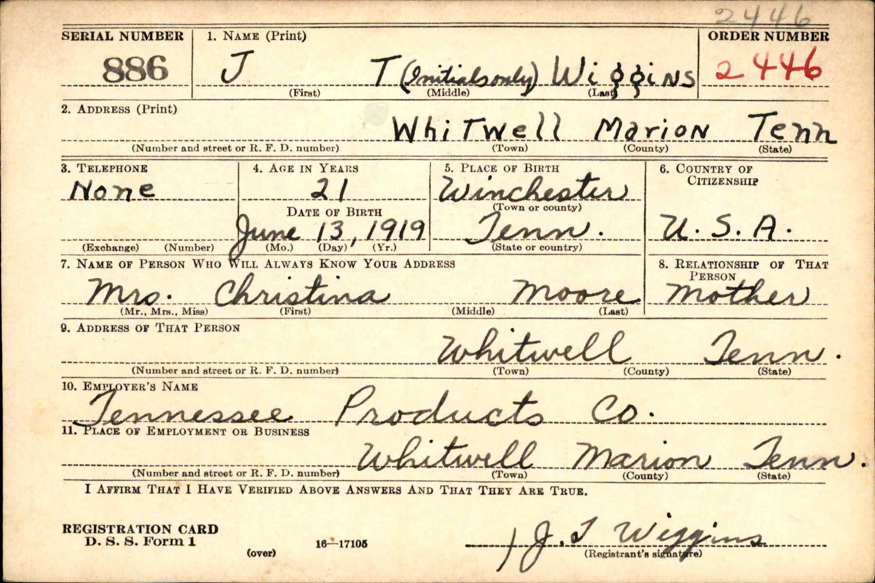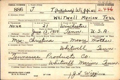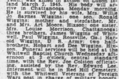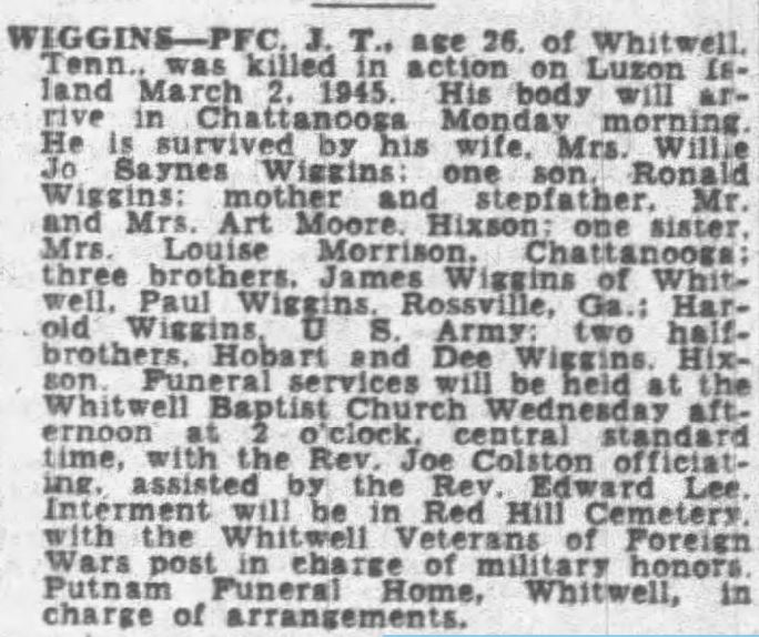 PFC J.T. Wiggins, age , of Whitwell, Tenn., was killed in action on Luzon Island March 2, 1945. His body will arrive in Chattanooga Monday morning. He is survived by his wife, Mrs. Willie Jo Saynes Wiggins; one son, Ronald Wiggins; mother and stepfather, Mr. and Mrs. Art Moore, Hixson; one sister, Mrs. Louise Morrison, Chattanooga, three brothers, James Wiggins of Whitwell, Paul Wiggins, Rossville, Ga.; Harold Wiggins, U.S. Army; two half-brothers, Hobart and Dee Wiggins, Hixson.