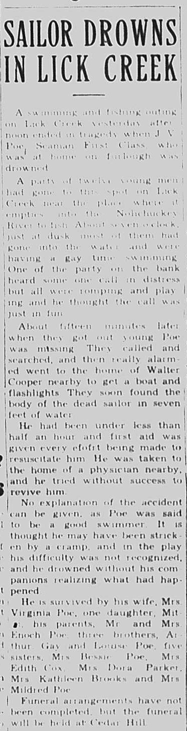 A swimming and fishing outing on Lack Creek yesterday afternoon ended in tragedy when J.V. Poe, Seaman First Class, who was at home on furlough was drowned. A party of twelve young men had gone to the spot on Lack Creek near the place where it empties into the Nolichucky River to fish about seven o’clock, just a dusk, most of them had gone into the water and were having a gay time swimming. One of the party on the bank heard some call in distress but all were romping and plaing and he thought the call was just in fun. About fifteen minutes later when they got out young Poe was missing. They called and searched, and then really alarmed went to the home of Walter Cooper nearby to get a boat and flashlights. They soon found the body of the dead sailor in seven feet of water. He had been under less than half an hour and first aid was given every effort being made to resuscitate him. He was taken to the home of a physician nearby, and he tried without success to revive him. No explanation of the accident was given, as Poe was said to be a good swimmer. It is thought he may have been stricken by a cramp, and in the play his difficulty was not recognized, and he drowned without his companions realizing what had happened.