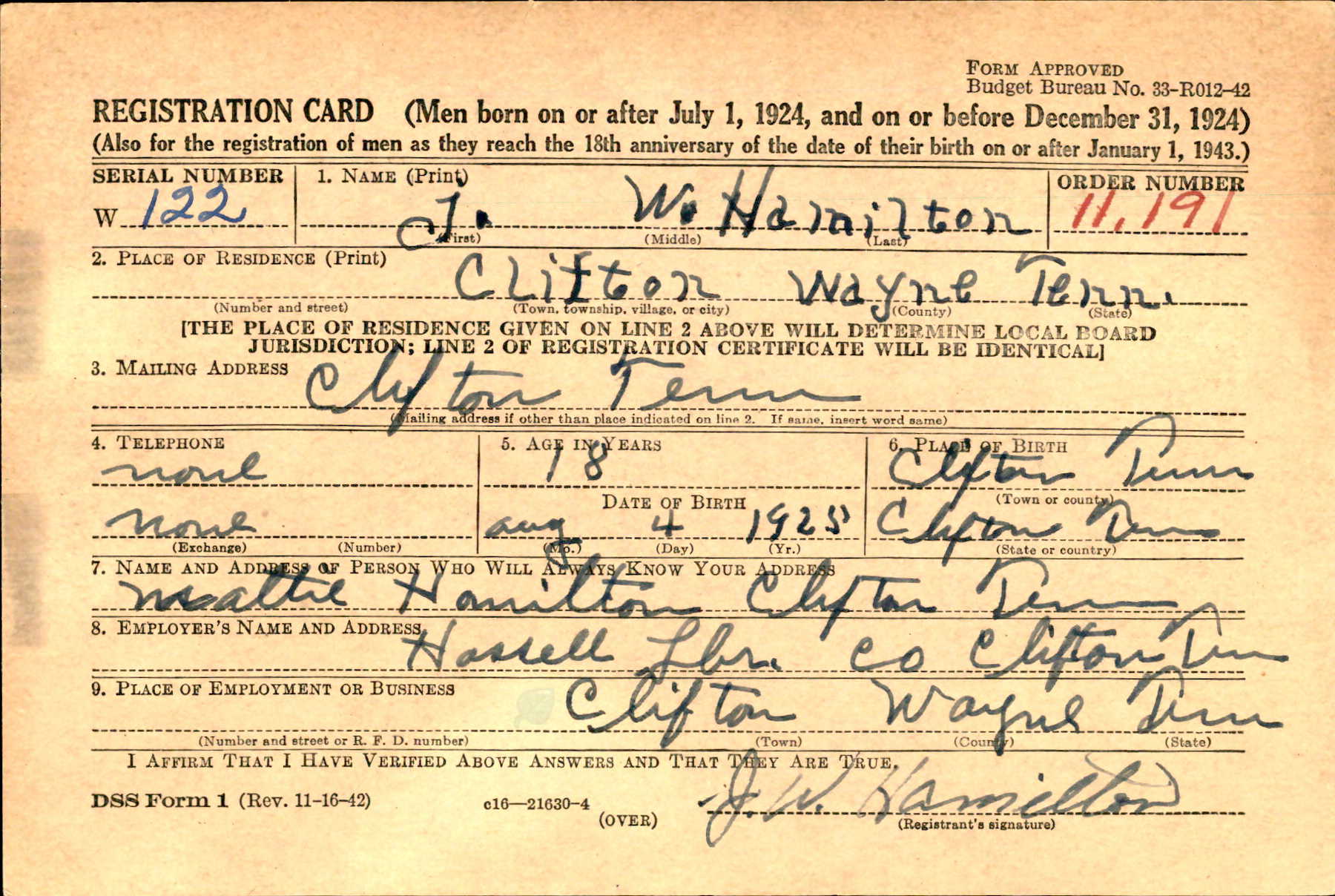J.W. Hamilton was born on 4 August 1925, the son of Clyde Hamilton and Mattie (Martha J) Bell.