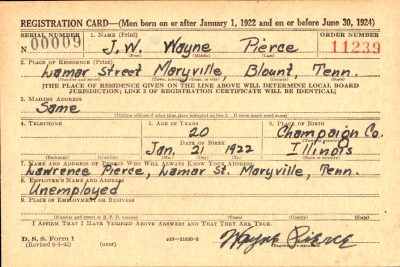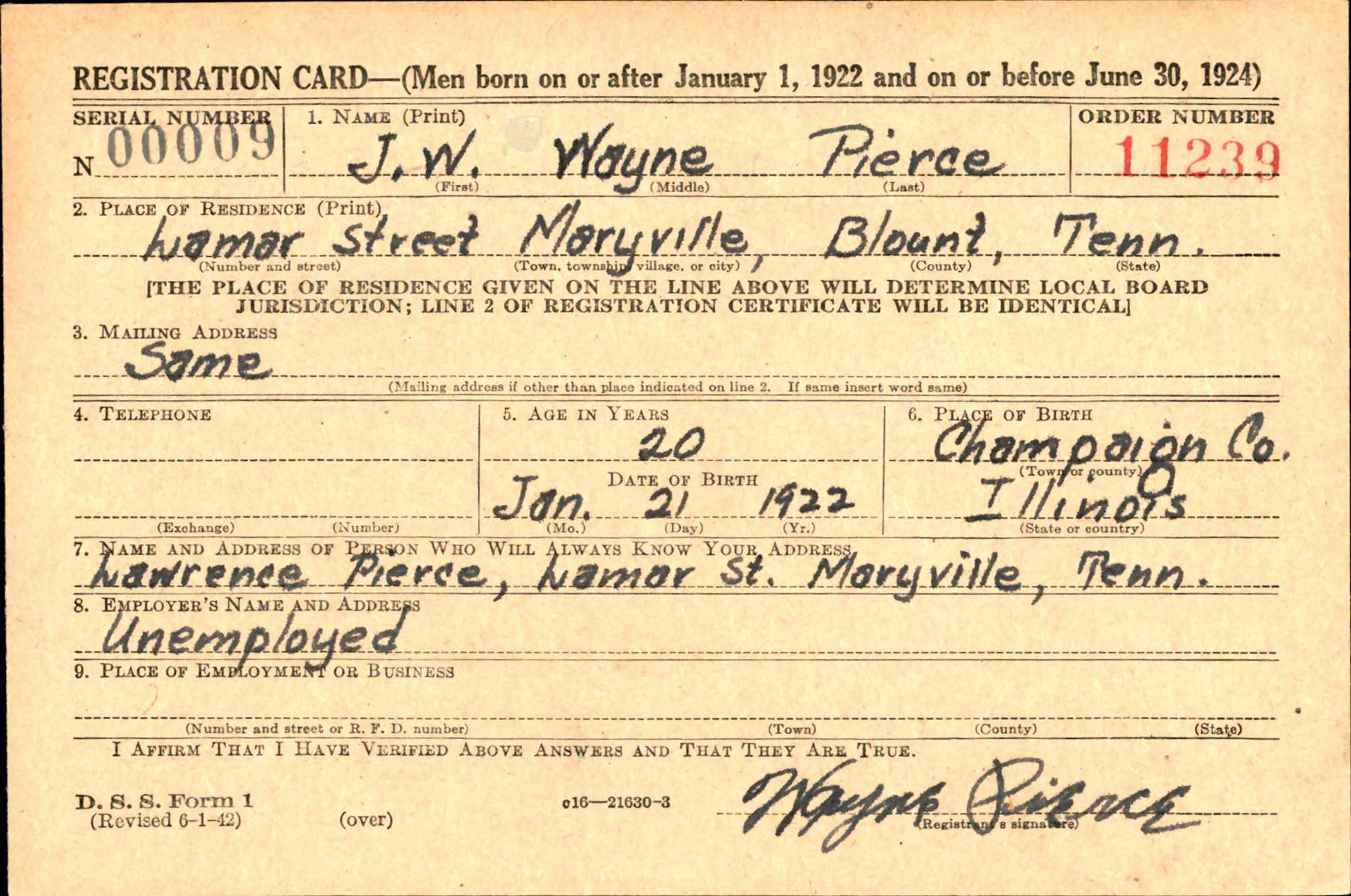 J.W. Wayne Piercewas the son of Joseph Lester Lawerence Pierce and Alice A. Gamble.