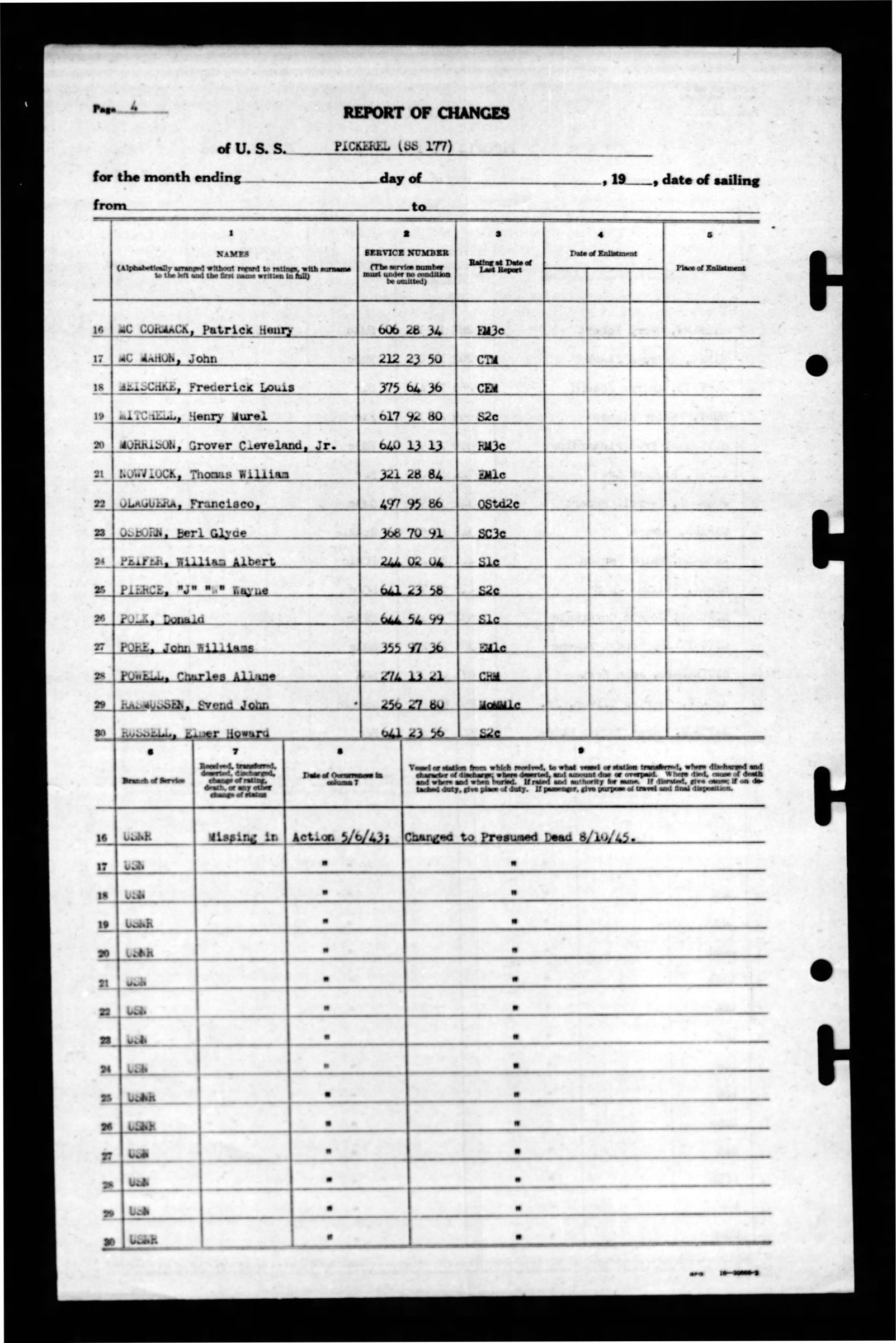 The loss of USS PICKEREL (SS-177) during her seventh war patrol is one of the many mysteries of World War II. She left Pearl Harbor in 18 March 1943, topped off with fuel at Midway on the 22nd, departed for the waters around Honshu, Japan, and was never heard from again.