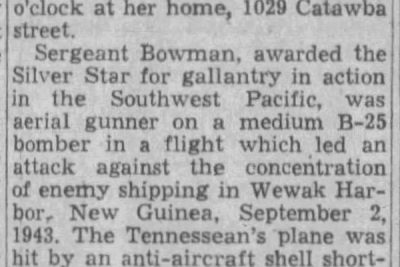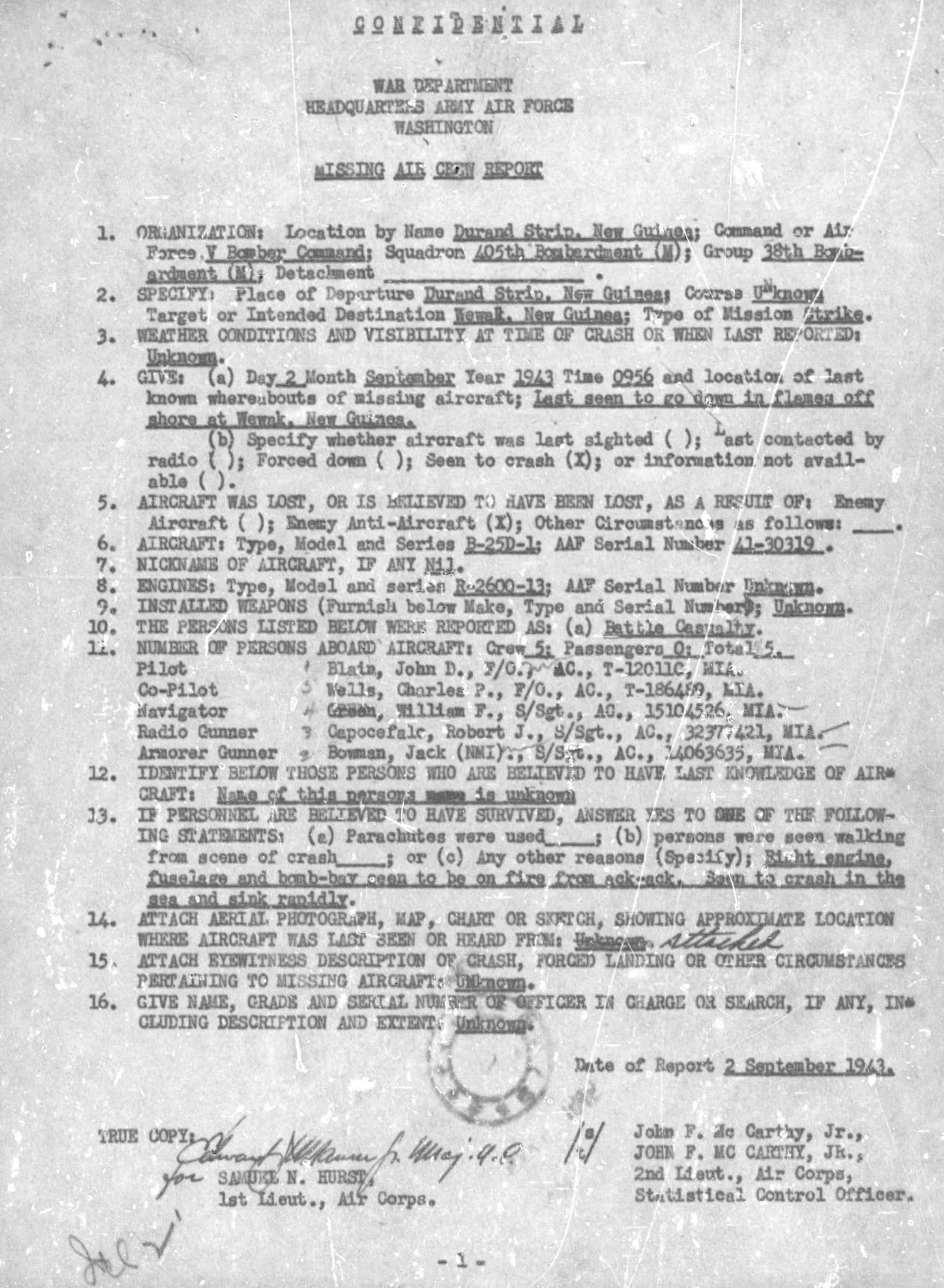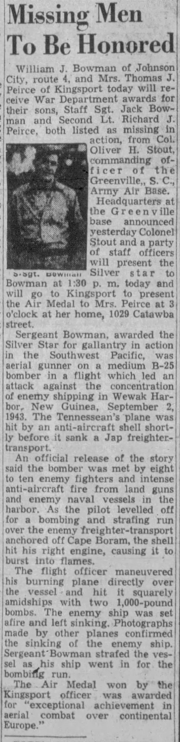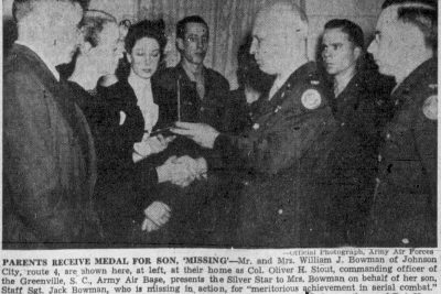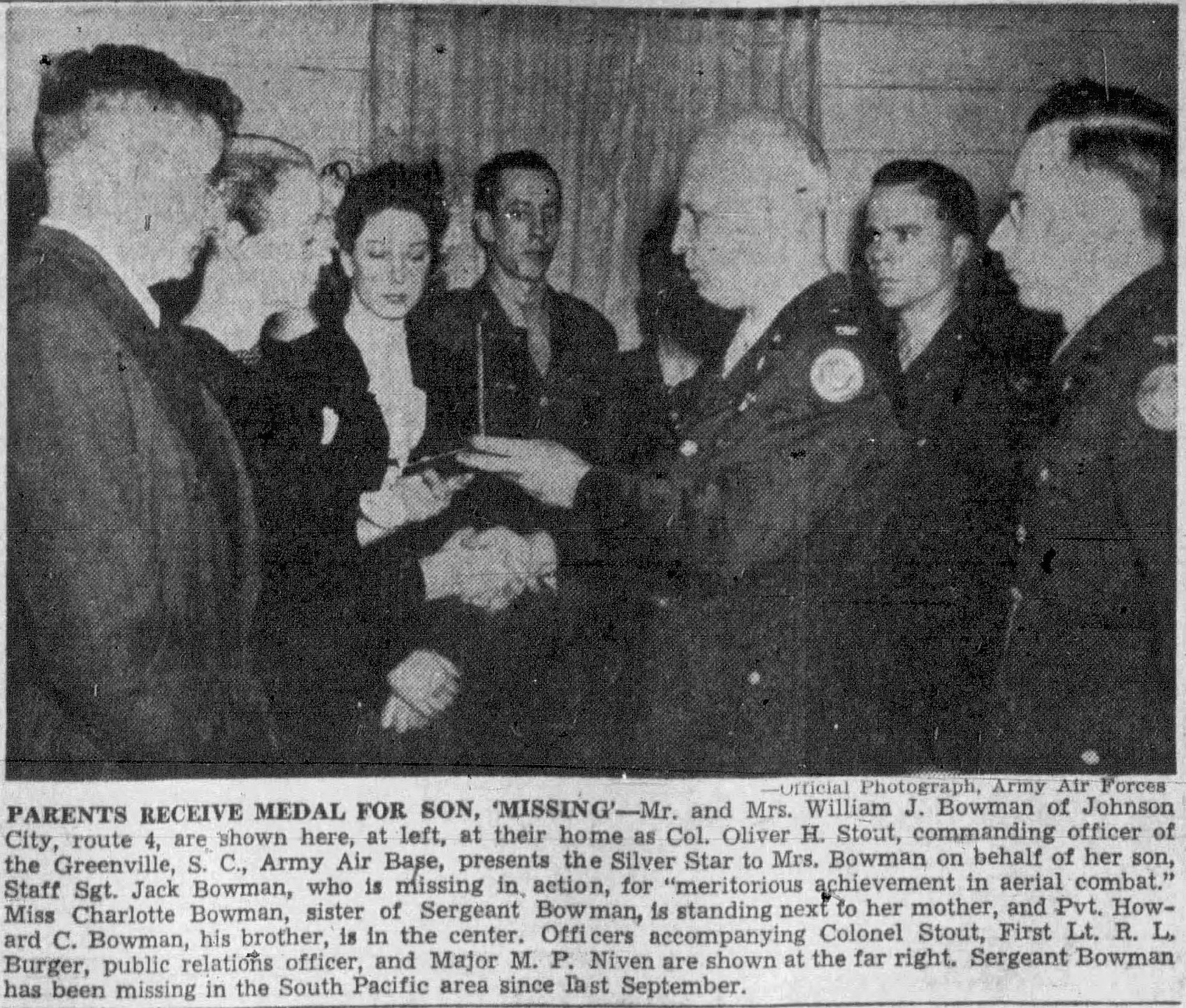 Staff Sergeant Jack Bowman was assigned to the 405th Bombardment Squadron, 38th Bomber Group M flying B-25’s out of New Guinea. He was given a finding of death on 2 September 1943, and is listed on the Tablets of the Missing, Manila American Cemetery, Philippines.