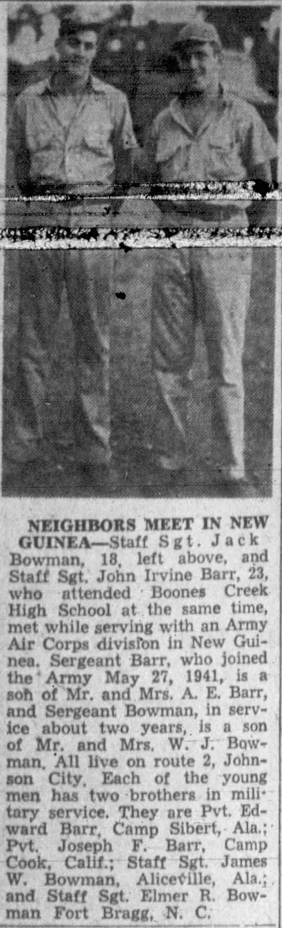 Jack Bowman was born in 1924, in Johnson City, Washington County, TN. Son of William Jacob Bowman and Lenna Robertha Hodge. His two brothers, James W. Bowman and Elmer Ben Bowman both served in the United States Army during World War II.