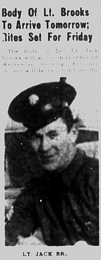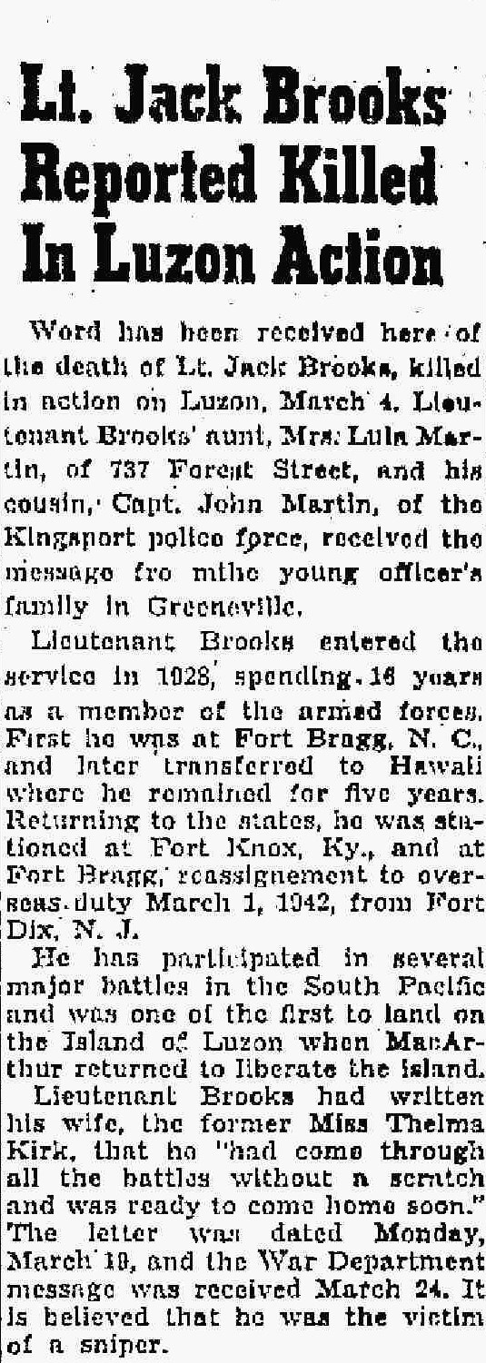 Word had been received here of the death of Lt Jack Brooks, killed in action on Luzon, March 4, Lieutenant Brooks´ aunt, Mrs. Lula Martin, of 737 Forent Street and his cousin, Captain John Martin, of the Kingsport police force, received the message from the young officer´s family in Greenville. Lieutenant Brooks entered the service in 1928, spending 16 years as a member of the armed forces. First he was at Fort Bragg, N.C. and later transferred to Hawaii where he remained for five years. Returning to the states, he was stationed at Fort Knox, Ky., and at Fort Bragg, reassignment to overseas duty March 1, 1942, from Fort Dix, N.J. He has participated in several major battles in the South Pacific and was one of the first to land on the Island of Luzon when MacArthur returned to liberate the island. Lieutenant Brooks had written his wife, the former Miss Thelma Kirk, that he ‘had come through all the battles without a scratch and was ready to come home soon’. The letter was dated Monday, March 19, and the war Department message was received March 24. It is believed that he was the victim of a sniper.