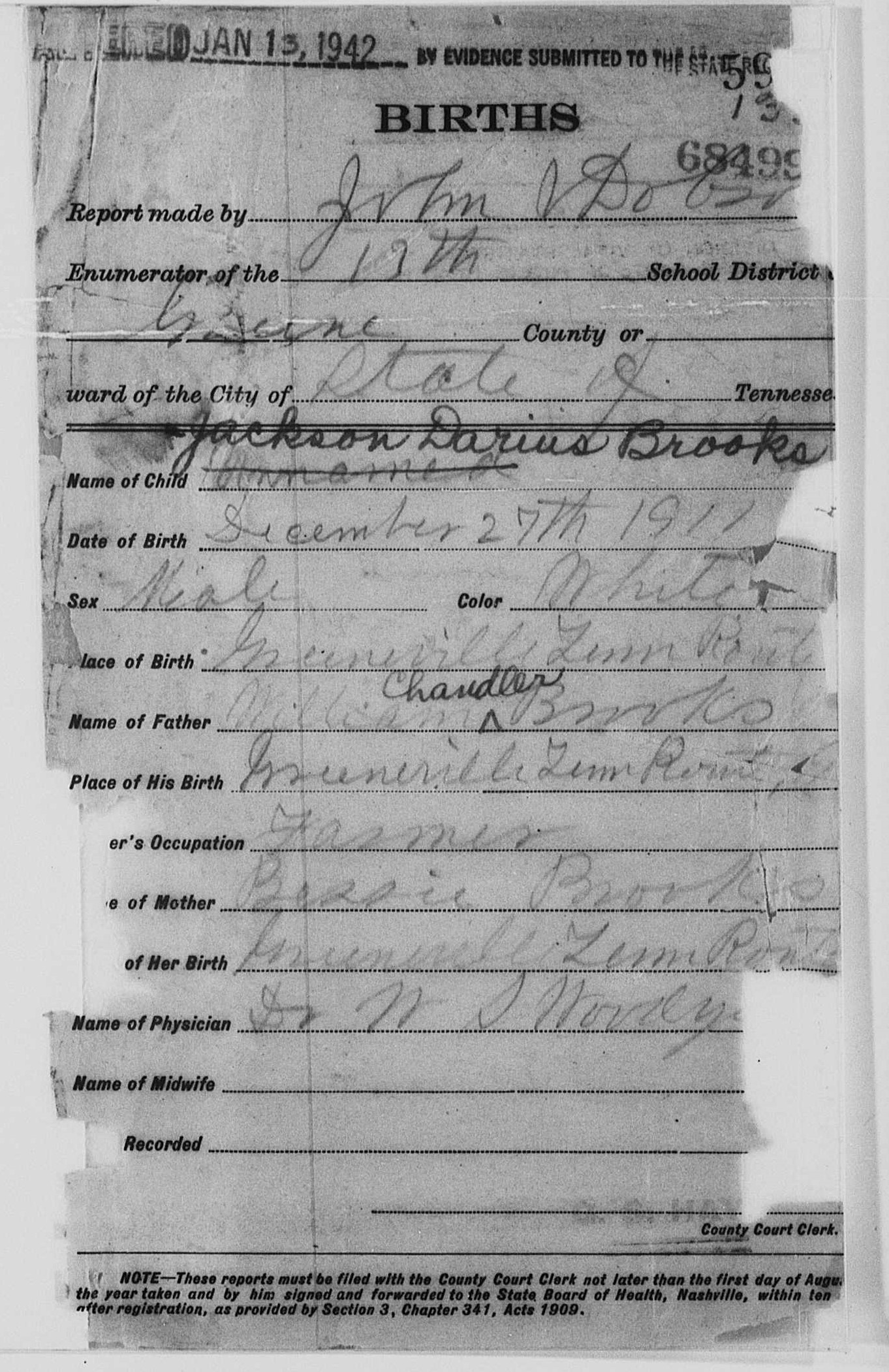 Jackson Darius “Jack” Brooks was born in Greeneville, Tennessee to William Chandler Brooks and Bessie Cleveland Gray. Husband of Thelma Elizabeth Kirk.