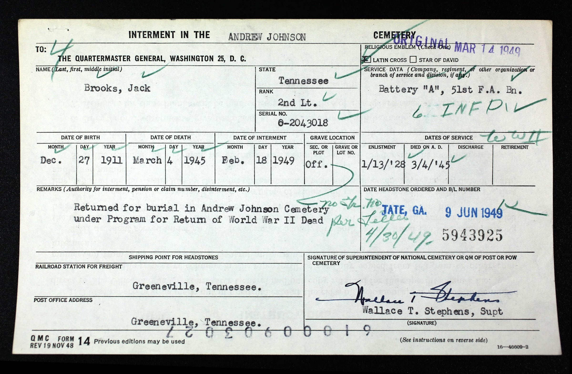 - Burial/Memorial Location: Andrew Johnson National Cemetery, Greeneville, TN