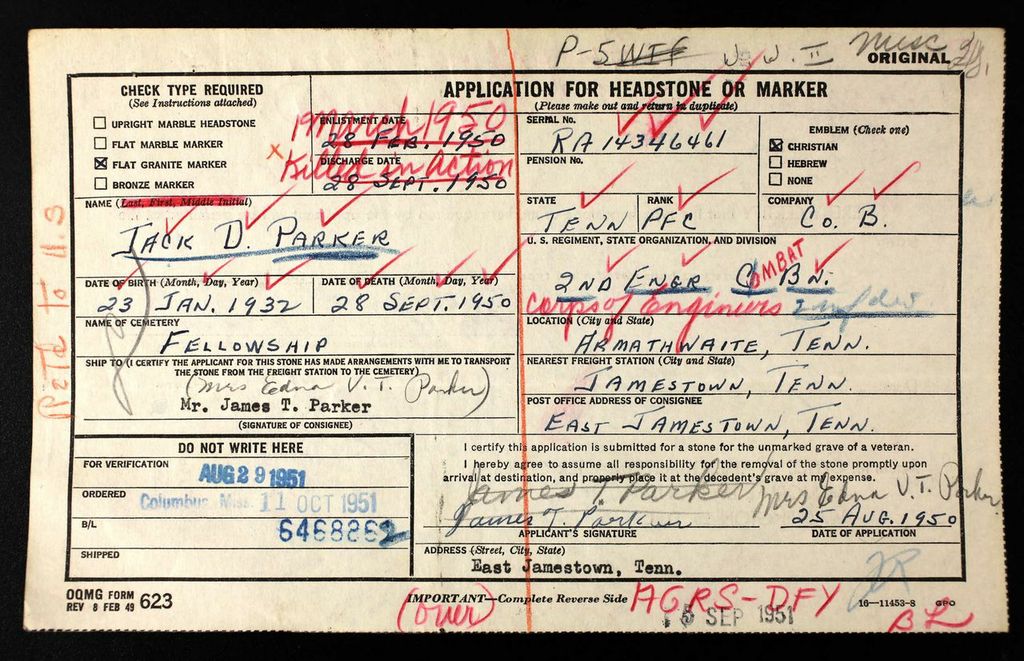 Private First Class Parker was a member of the 2nd Engineer Combat Battalion, 2nd Infantry Division. He was Killed Action while fighting the enemy in South Korea. Buried at Fellowship Cemetery, Armathwaite, TN.