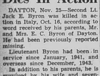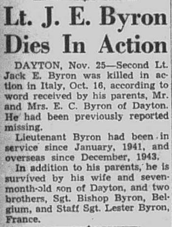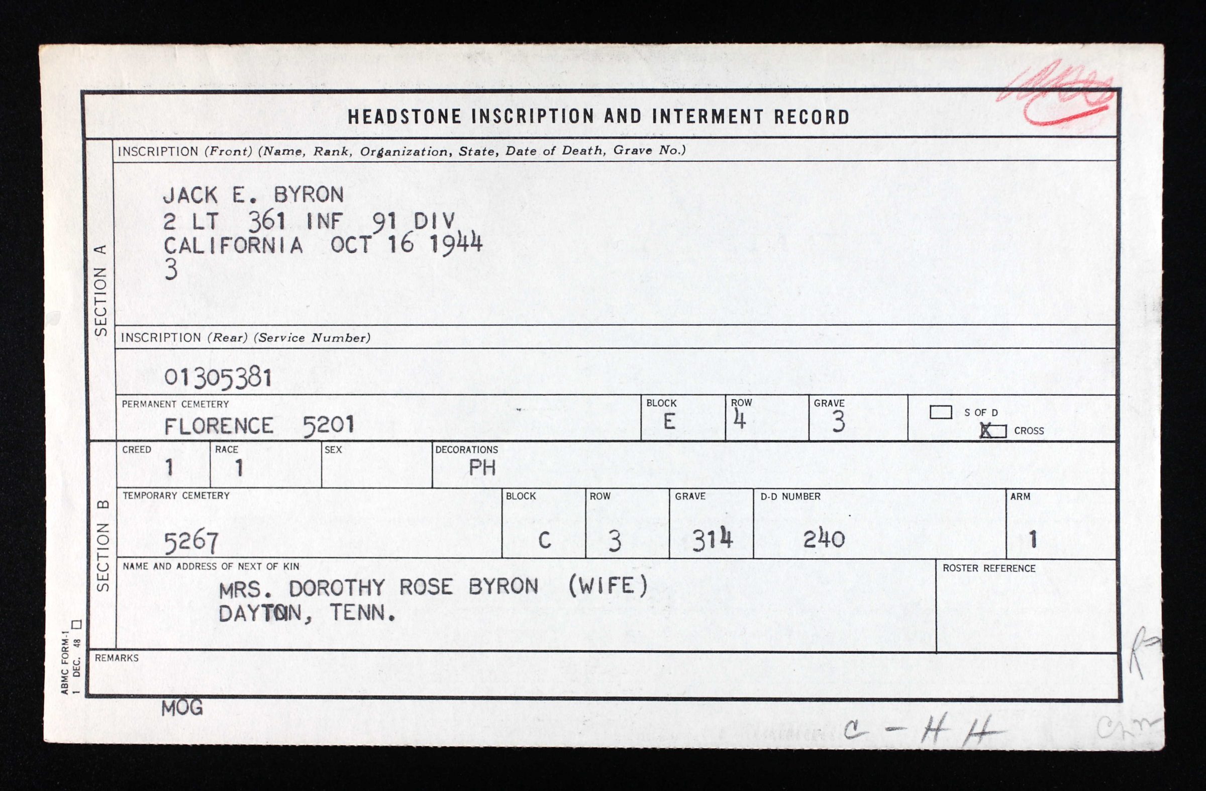 Lt. Byron was Killed in Action, October 16, 1944 in Italy and initially buried at Pietramala Cemetery at Mount Beni, Italy and reburied at Florence American Cemetery, E, 4, 3