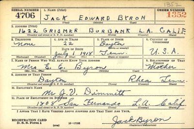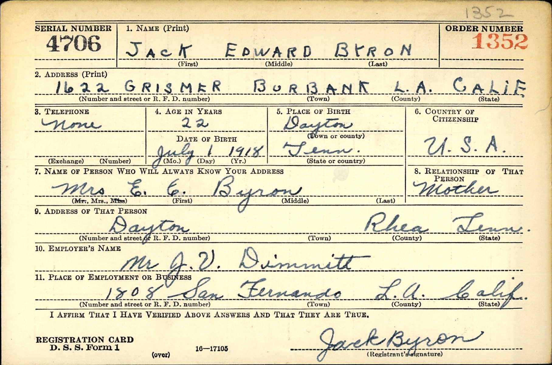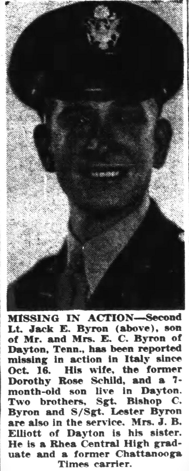 Jack Edward Byron was born in 1918 in Tennessee to Ellis Courtland Byron and Imogen Woollen. He was married to Dorothy Rose Schild and had a seven-month old son, Jackie. His brother Private Ellis Courtland Byron died in 1942.