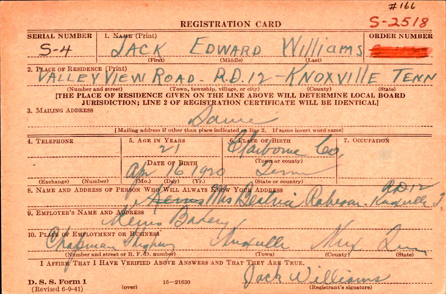 Jack Edward Williams enlisted in the Army Air Corps on September 23, 1941, in Fort Oglethorpe, GA