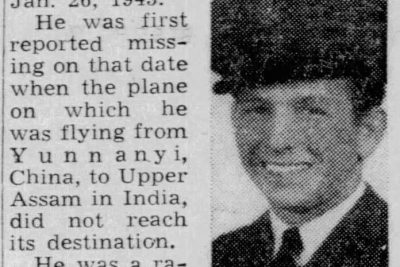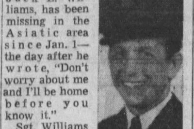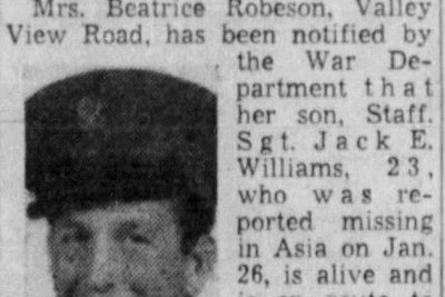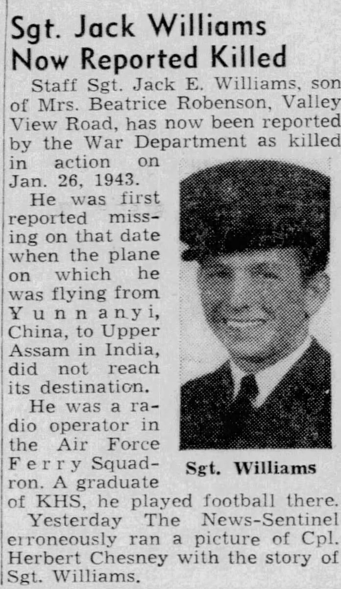 Staff Sgt. Jack E. Williams, son of Mrs. Beatrice Robenson, Valley View Road, has now been reported by the War Department as killed in action on Jan. 26, 1943. He was first reported missing on that date when the plane on which he was flying from Uynnanyi, China, to Upper Assam in India, did not reach its destination. He was a radio operator in the Air Force Ferry Squadron. A graduate of KHS, he played football there.