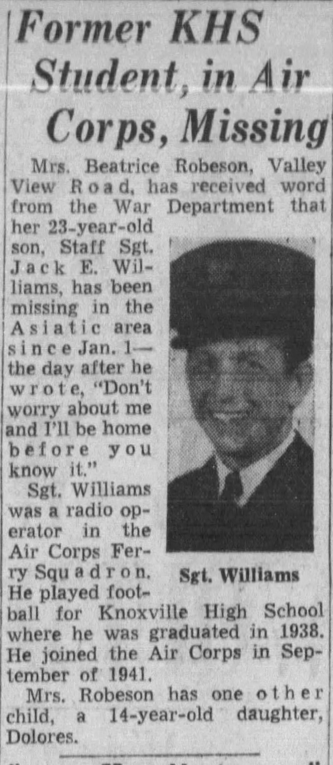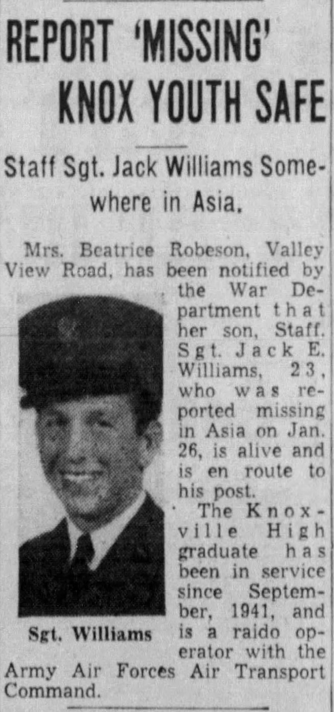 Mrs. Beatice Robeson has been notified by the War Department that her son, Staff Sgt. Jack E. Williams, 23, who was reported missing in Asia on Jan. 26, is alive and is en route to his post. The Knoxville High graduate has been in service since September, 1941, and is a radio operator with the Army Air Forces Air Transport Command.