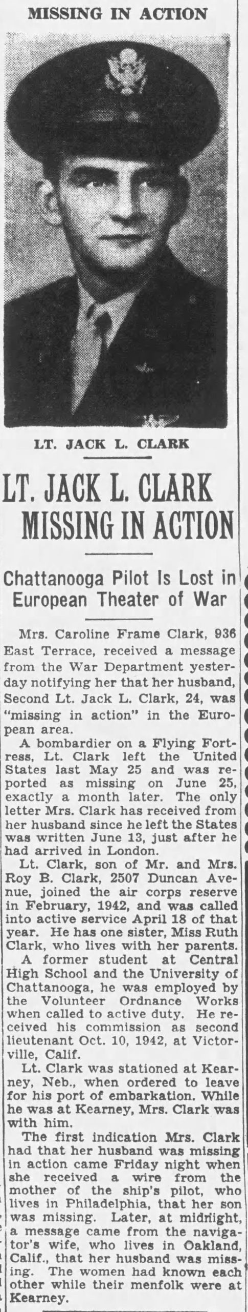 Mrs. Caroline Frame Clark, 936 East Terrace, received a message from the War Department yesterday notifying her that her husband, Second Lt. Jack L. Clark, 24, was “missing in action” in the European area. A bombardier on a Flying Fortress, Lt. Clark left the United States last May 25