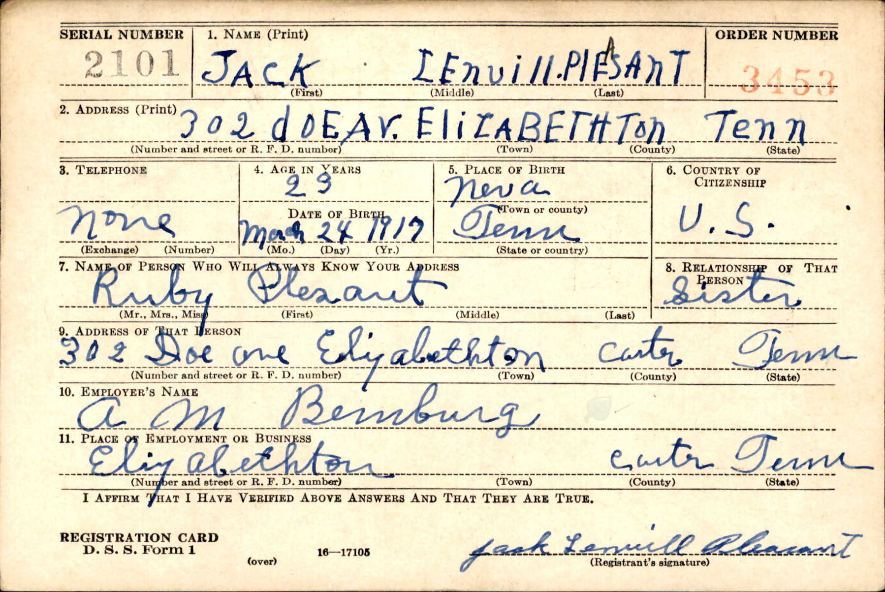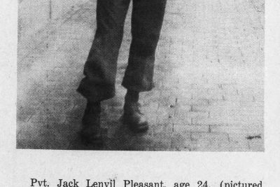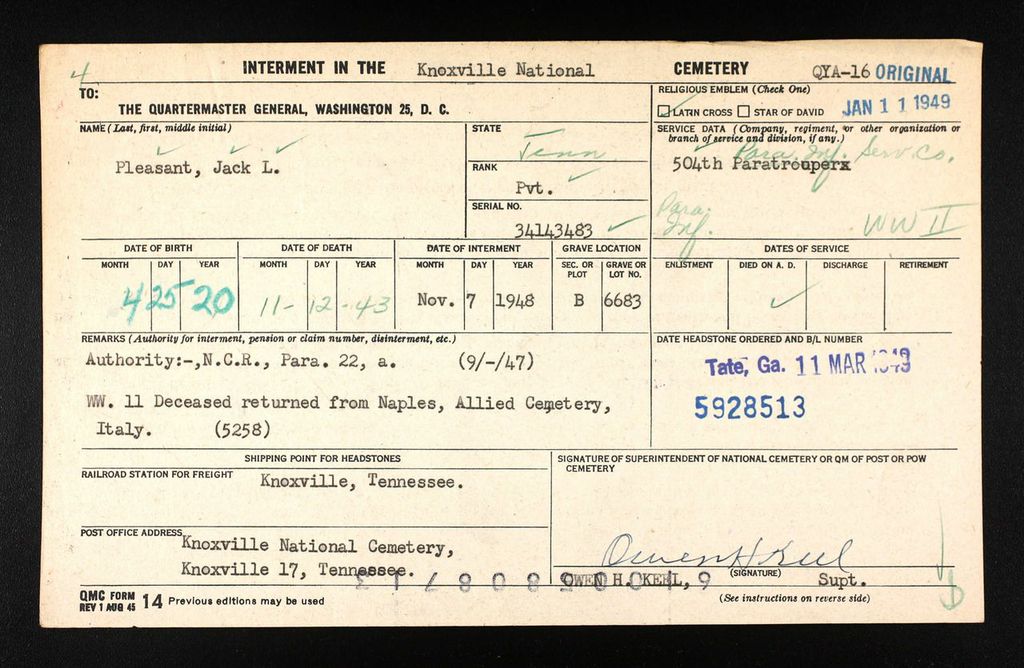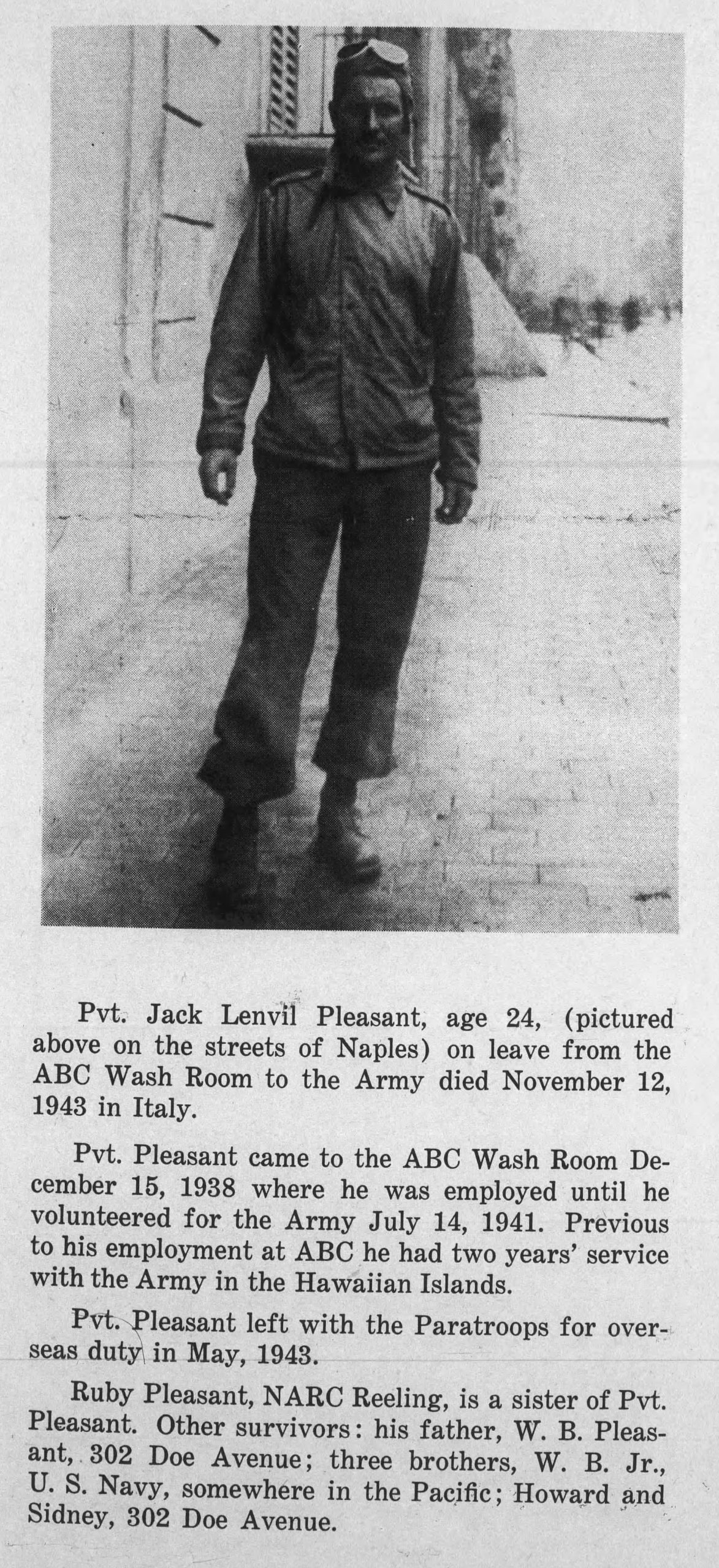 Jack Lenvill Pleasant was born on 25 April 1920 at Neva, Tennessee, the son of Walter Brownlow Pleasant Sr. and Sanna N Church. He had one sister, Mrs. Ruby Moore and three brothers, Walter Jr., Howard and Sidney, all of Elizabethton. Jack Pleasant was employed at the ABC Wash Room from December 15, 1938 until he volunteered for the Army July 14, 1941. Previous to his employment at ABC he had two years’ service with the Army in the Hawaiian Islands. Pvt. Pleasant left with the Paratroops for overseas duty in May, 1943.