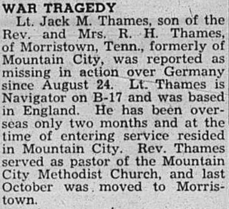 Lt. Jack M. Thames, son of the Rev. And Mrs. R.H. Thames, of Morristown, Tenn., formerly of Mountain City, was reported as missing in action over Germany since August 24. Lt. Thames is Navigator on B-17 and was based in England. He has been overseas only two months and at the time of entering service resided in Mountain City. Rev. Thames served as pastor of the Mountain City Methodist Church, and last October was moved to Morristown.