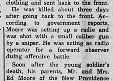 Beside the parents, Pfc. Moore is survived by one brother, Billy H., at home; grandparents, Mr. and Mrs. Tom Moore, Kingston, and Mr. and Mrs. J.H. Palmer of Fountain City. Funeral services will be held at the New Providence Church. Burial in the Church cemetery.