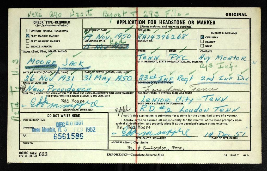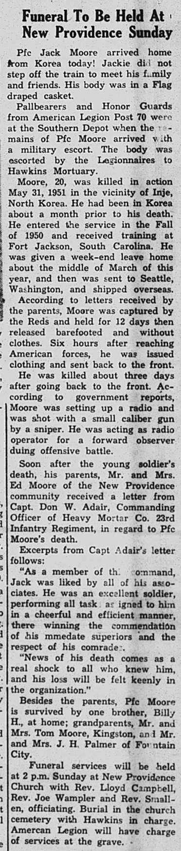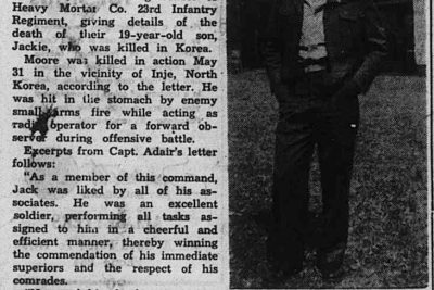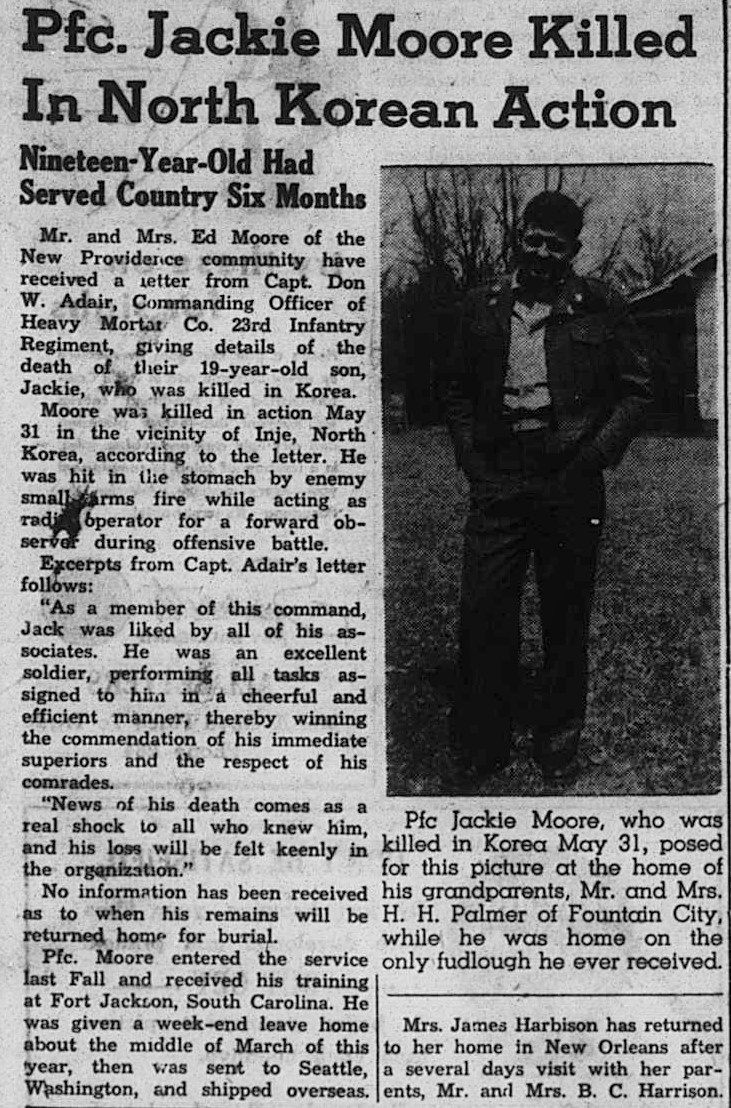 Mr. and Mrs. Ed Moore of the New Providence community have received a letter from Capt. Don W. Adair, Commanding Officer of Heavy Mortar Co. 23rd Infantry Regiment, giving details of the death of their 19-year-old son, Jackie, who was killed in Korea. Moore was killed in action May 31, in the vicinity of Inje, North Korea, according to the letter. He was hit in the stomach by enemy small arms fire while acting as radio operator for a forward observer during offensive battle. Excerpts from Capt. Adair’s letter follows: