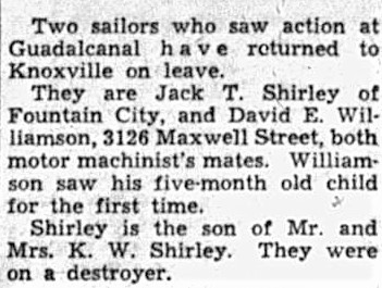 Two sailors who saw action at Guadalcanal have returned to Knoxville on Leave. They are Jack T. Shirley of Fountain City and David E. Williamson. Shirley is the son of Mr. and Mrs. K.W. Shirley. They were on a destroyer.