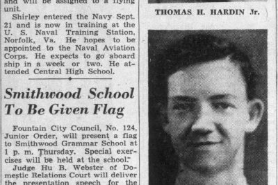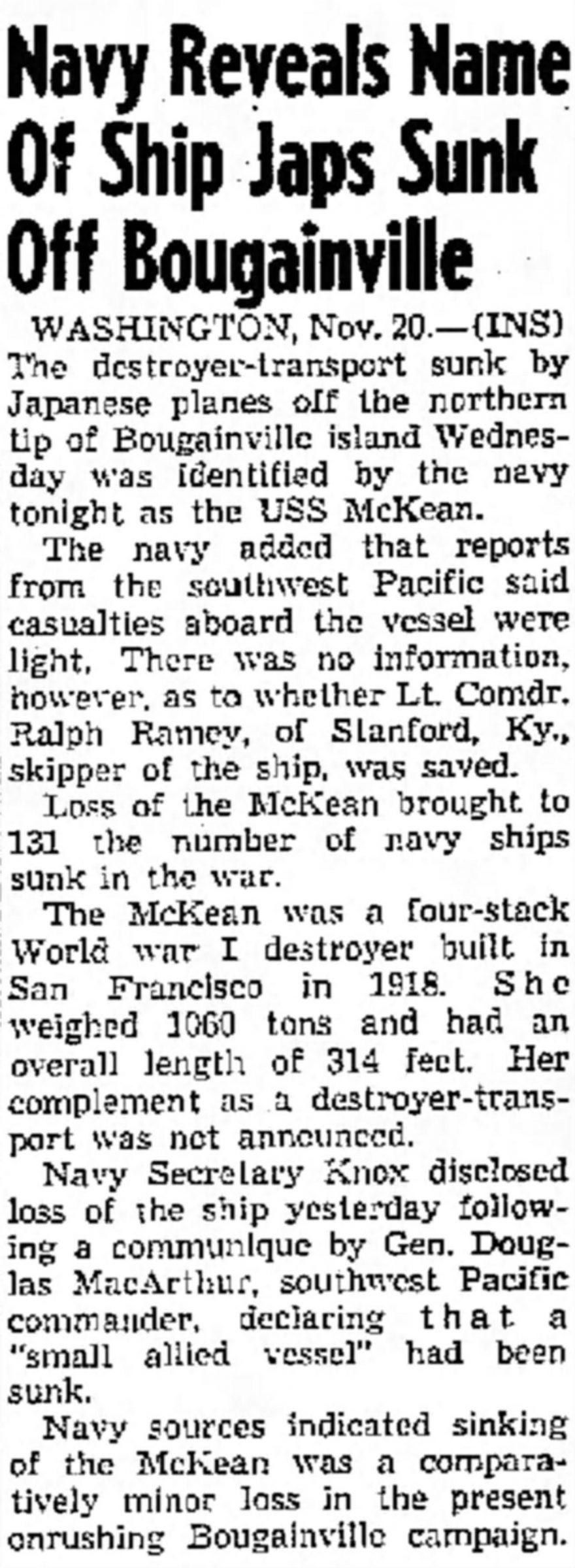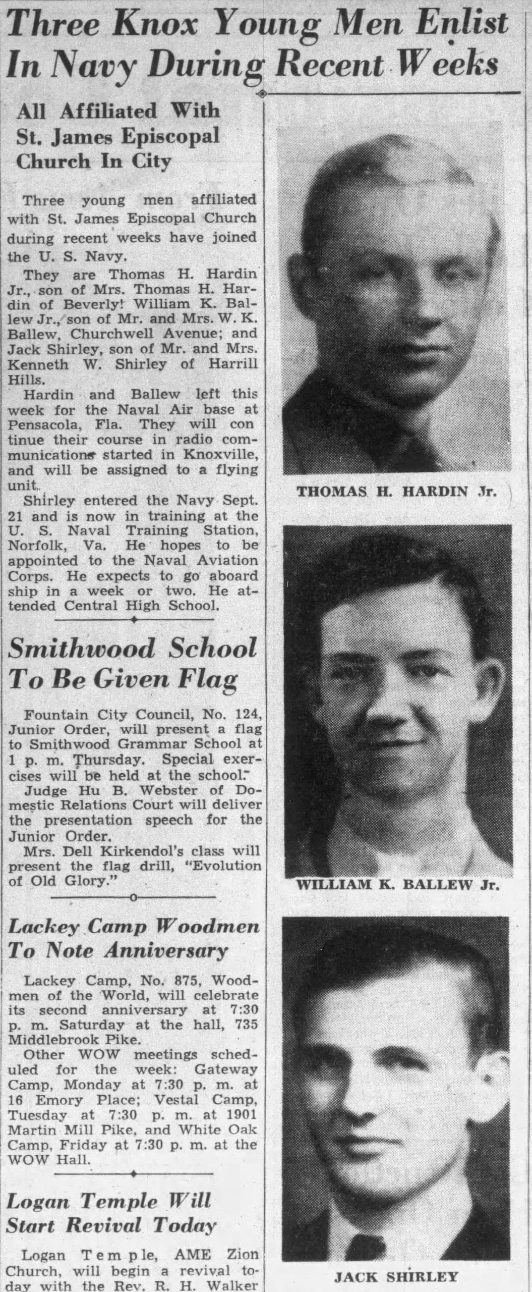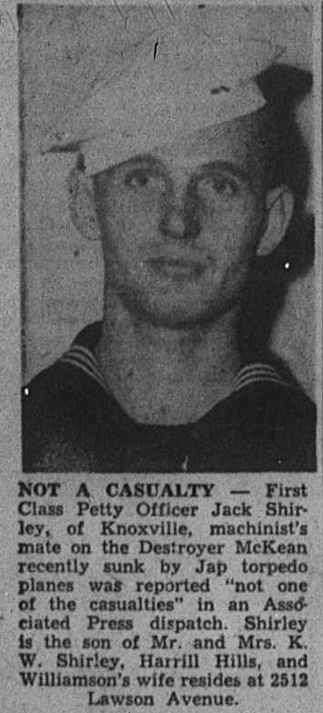 Not a casualty – First Class Petty Officer Jack Shirley, of Knoxville, machinist’s mate on the Destroyer McKean recently sunk by Jap torpedo planes was reported “not one of the casualties” in an Associated Press dispatch. Shirley is the son of Mr. and Mrs. K.w. Shirley, Harrill Hills, and Williamson’s wife resides at 2512 Lawson Avenue.