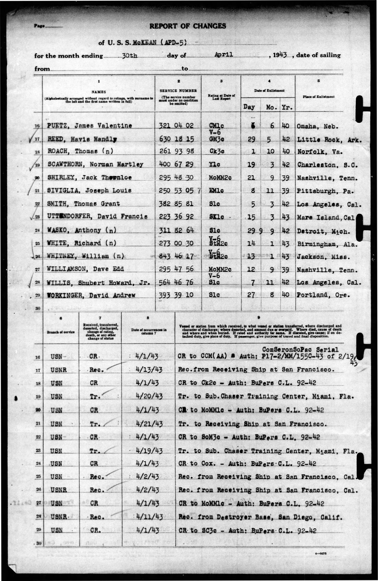 Served aboard the USS McKean (APD-5). The USS McKean was sunk by Japanese planes off the northern tip of Bougainville Island, Marianas Islands on 17 November 1943. Jack Shirley was officially declared dead on 18 November 1944. He is memorialized at Manila American Cemetery in Fort Bonifacio, Manila, Philippines