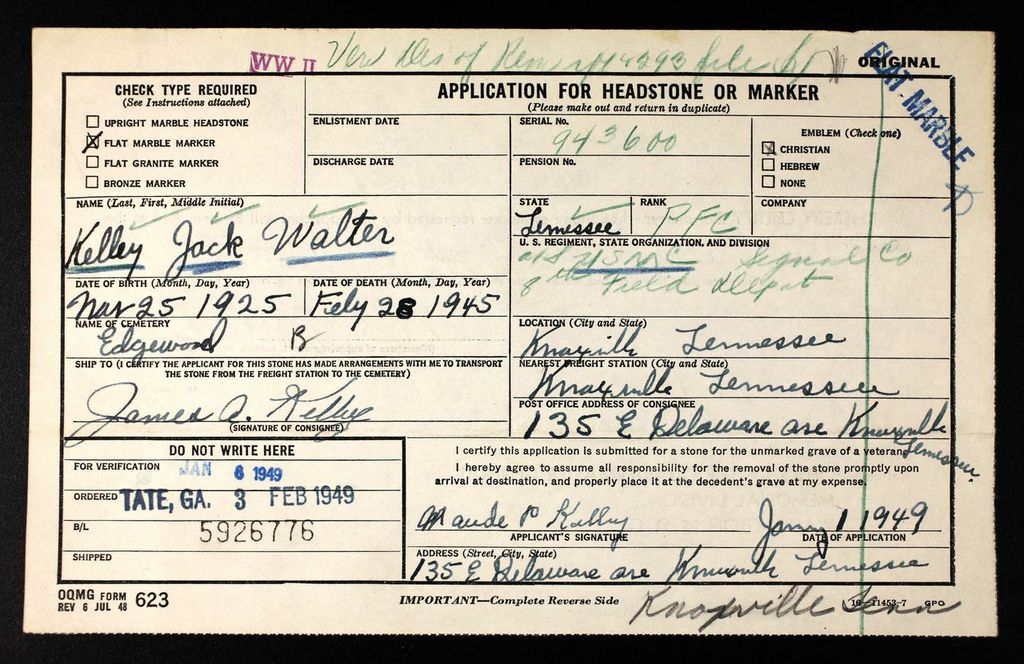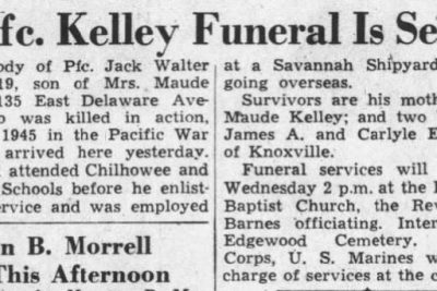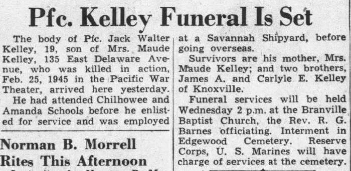 The body of Pfc. Jack Walter Kelley, 19, son of Mrs. Maude Kelley, 135 East Delaware Avenue, who was killed in action Feb. 25, 1944 in the Pacific War Theater, arrived here yesterday. He had attended Chilhowee and Amanda School before he enlisted for service and was employed at a Savannah Shipyard, before going overseas. Survivors are his mother, Mrs. Maude Kelley; and two brothers, James A. and Carlye E. Kelley of Knoxvilel.
