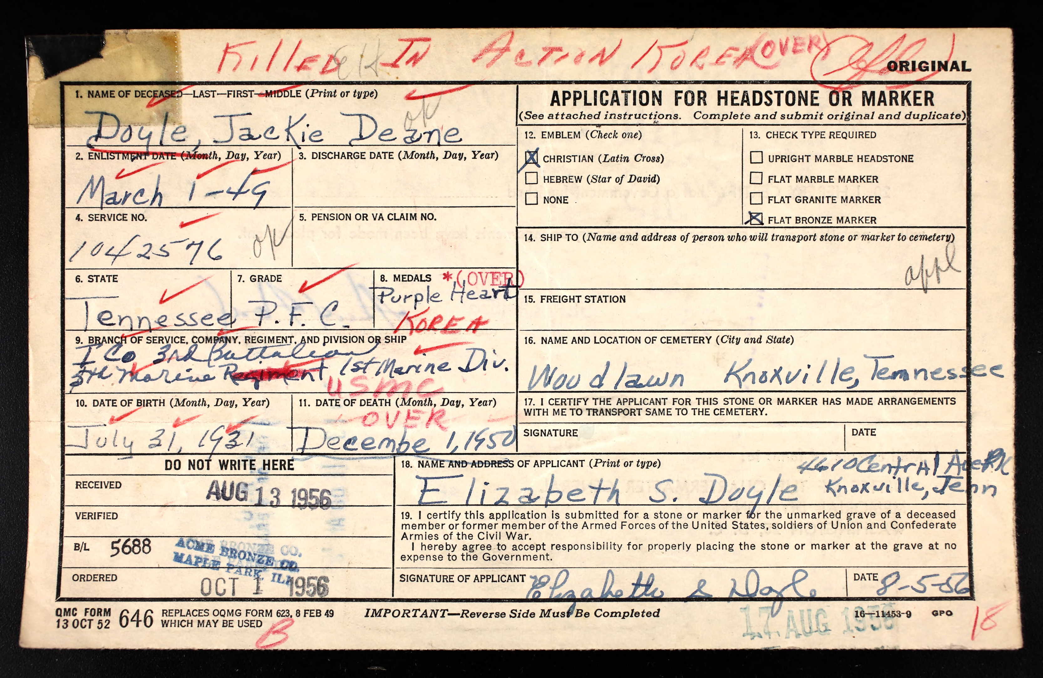 Jackie Deane Doyle was one of eleven children born to Horace Eugene Doyle and Elizabeth Keith Doyle. He was raised in South Knoxville and was a member of Vestal United Methodist Church. He attended South High School until his family moved to old North Knoxville and he continued his education at Knoxville High School. Jackie joined the United States Marines Reserve and was called to active duty in Korea. He left Knoxville for training at Camp Pendleton, CA, in September of 1950. After training, he was assigned to I company, 3rd Battalion, 5th Marine Regiment, 1st Marine Division, Korea. While in Korea, his company was involved in the initial deployment to combat the Communist troops invading Korea. It was during this campaign in the Chosin Reservoir that his company came under intense hostile attack. It was reported that after the attack that I company existed on paper only with only twenty men left. Jackie was killed in action on December 1, 1950. He was initially listed as missing in action the day after the battle. It would be exactly three years until he was officially declared killed in action. Jackie was not returned home for funeral services and burial until September 11, 1955. He was buried at Woodlawn Cemetery with full military honors provided by the United States Marine Corps. Private First Class Doyle was posthumously awarded the Purple Heart on March 4, 1954. Other awards and citations include the Korean Service Medal, the United Nations Service Medal, and the National Defense Service Medal.