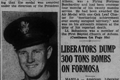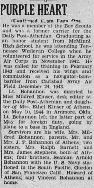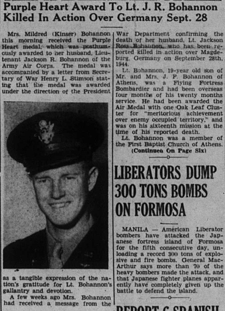 Lt. Bohannon, 19-year old son of Mr. and Mrs. J.F. Bohannon of Athens, was a Flying Fortress Bombardier and had been overseas four months of his twenty months service. He had been awarded the Air Medal with one Oak Leaf Cluster for “meritorious achievement over enemy occupied territory,” and was on his sixteenth mission at the time of his reported death.