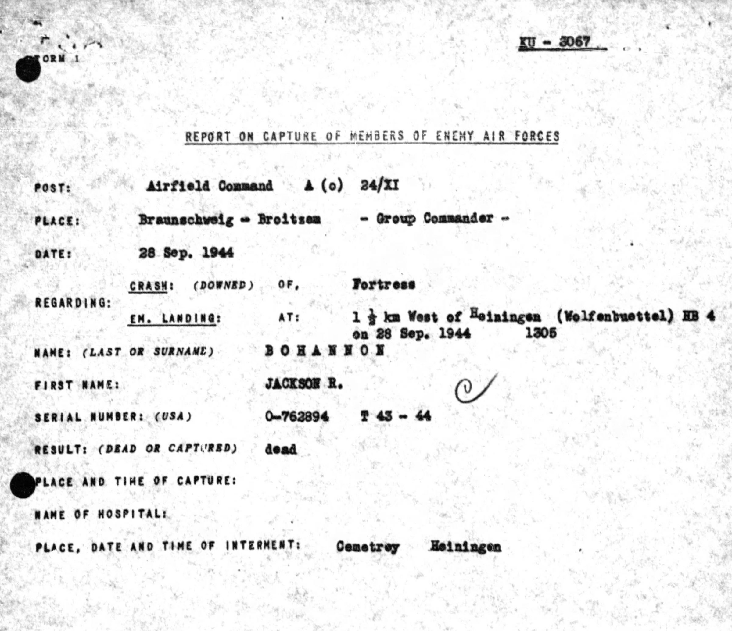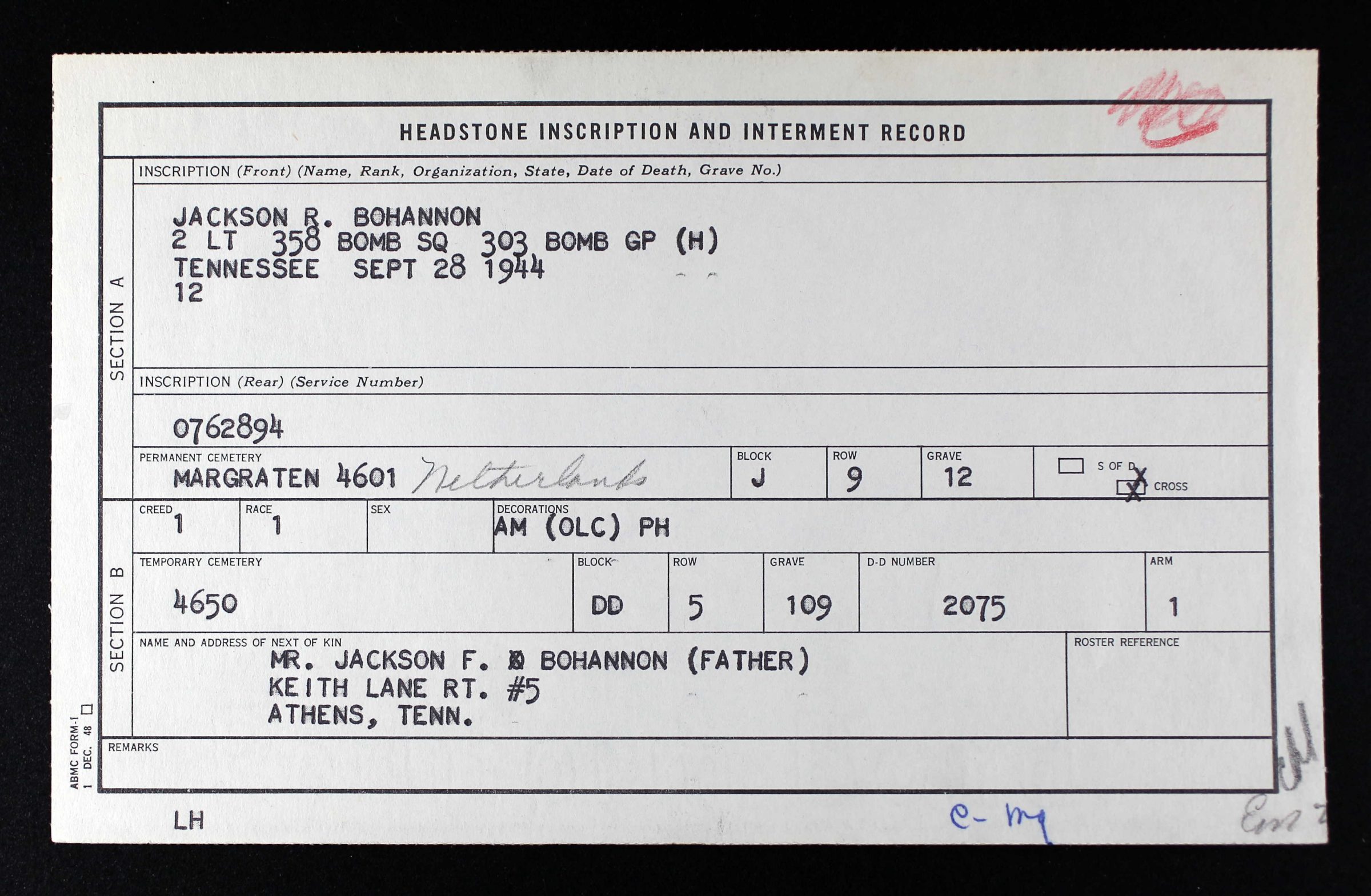 2nd Lieutenant Jackson R. Bohannon O-762894 US Army Air Forces was born in 1925 in McMinn County, Tennessee. He was the son of Jackson Filiman Bohannon and Edna Earl Black. His siblings were James G., Sadie B., Alta I., Norman H., Arnold, and Raymond V.