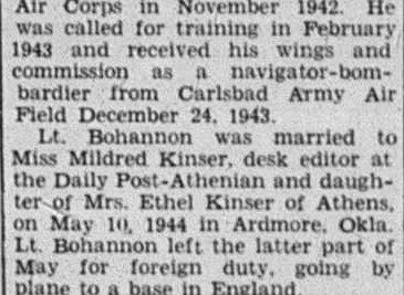 Lt. Bohannon was married to Miss Mildred Kinser, desk editor at the Daily Post-Athenian and daughter of Mrs. Ethel Kinser of Athens, on May 10, 1944 in Ardmore, Okla. Lt. Bohannon left the latter part of May for foreign duty, going by plane to a base in England.