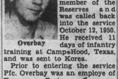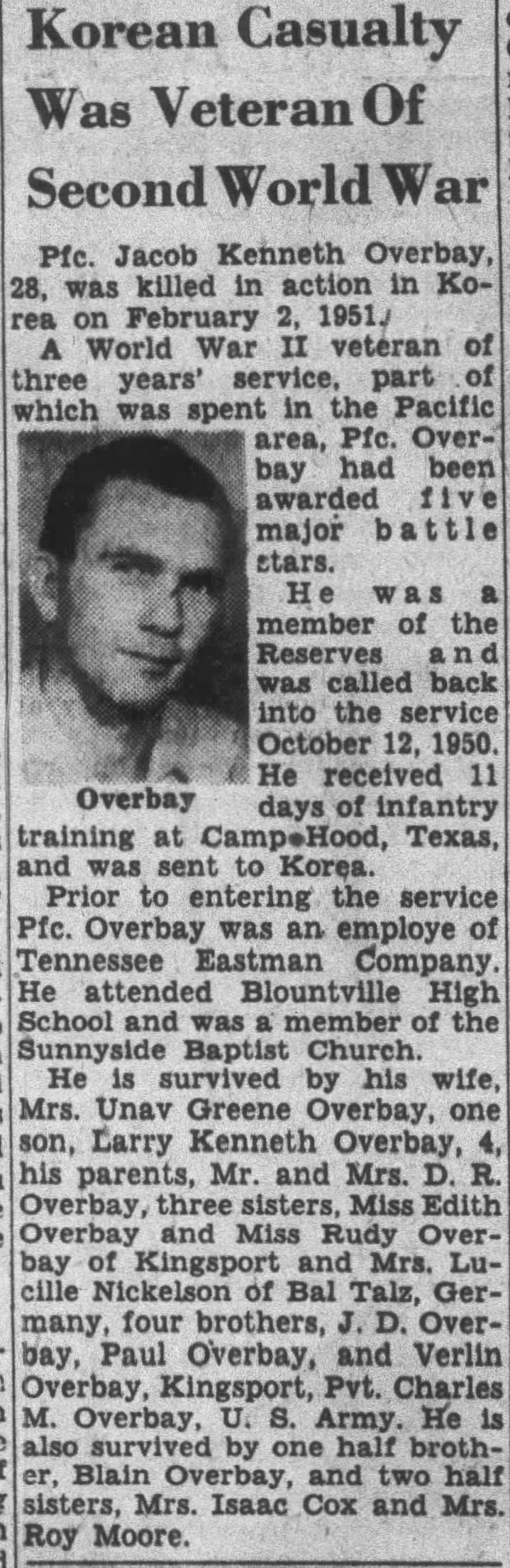 A World War II veteran of three years’ service, part of which was spent in the Pacific area, Pfc. Overbay had been awarded five major battle stars. He was a member of the Resereves and was called back into the service October 12, 1950. He received 11 days of infantry training at Camp Hood, Texas, and was sent to Korea. Prior to entering the service Pfc. Overbay was an employe of Tennessee Eastman Company. He attended Blountville High School and was a member of the Sunnyside Baptist Church. He is survived by his wife, Mrs. Unav Greene Overbay, one son, Larry Kenneth Overbay, 4, his parents, Mr. and Mrs. D.R. Overbay, three sisters, Misses Edith Overbay and Miss Rudy Overbay of Kingsport and Mrs. Lucille Nickelson of Bal Talz, Germany, four brothers, J.D. Overbay, Paul Overbay, and Verling Overbay, Kingsport, Pvt. Charles M. Overbay, U.S. Army. He is also survived by one half brother, Blain Overbay, and two half sisters, Mrs. Isaac Cox and Mrs. Roy Moore.