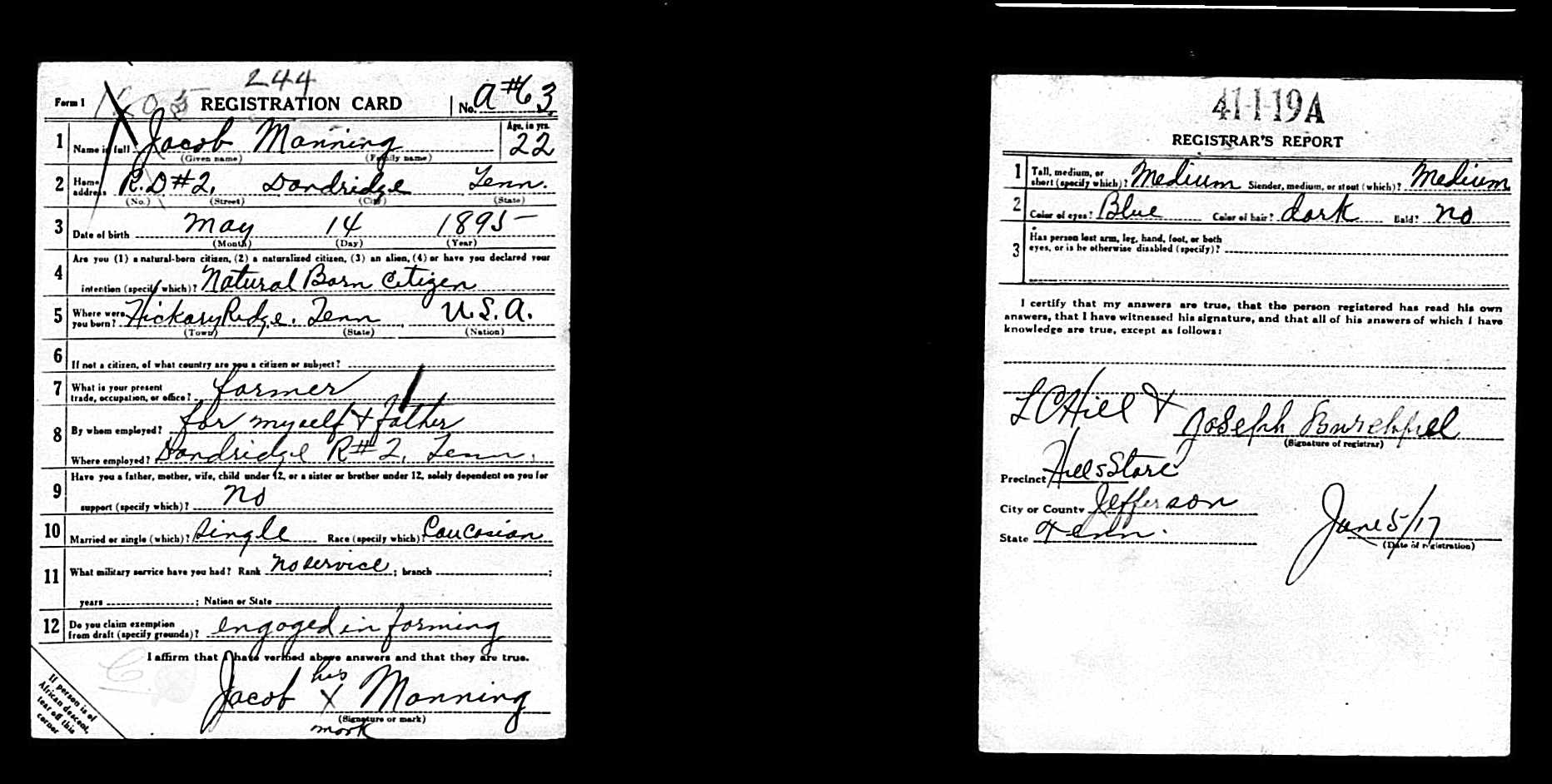 Jacob Manning was born 14 May 1895, Hickory Ridge, Tennessee to John W. and Polly Gorr Manning. He entered the service March 29, 1918 at Jefferson City in Tennessee and received his training at Camp Gordon in Atlanta, Georgia and Camp Upton, N.Y. He arrived in Europe on May the 9th, 1918. He was killed in action 16 October 1918 at the Argonne Forest in France and was initially buried on the battlefield, Hill #180.