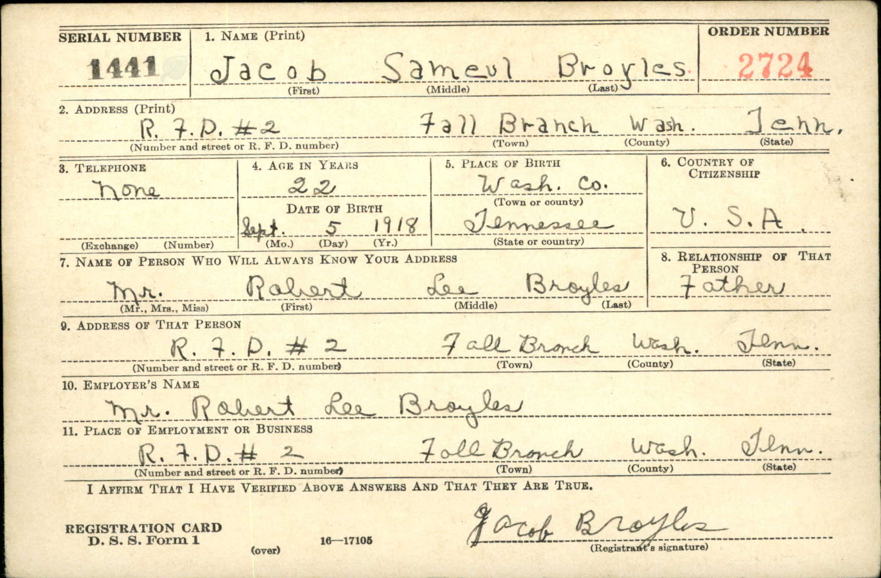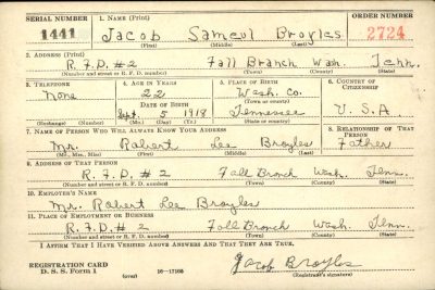 Jacob Samuel Broyles was born in Fall Branch, Washington, Tennessee, the son of Robert Lee Broyles and Lola Mae Moore.