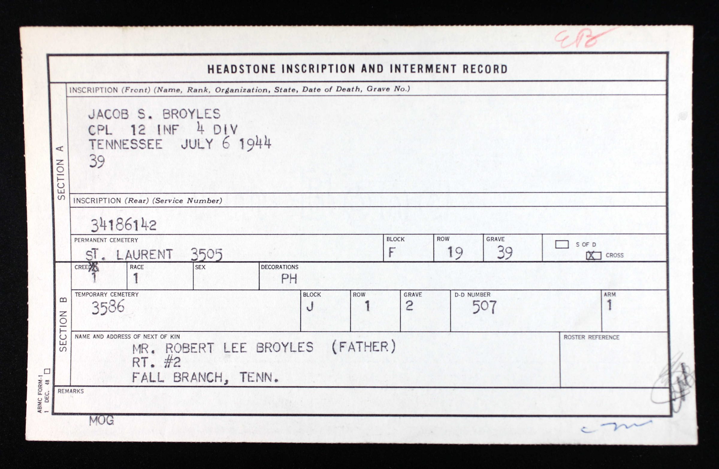 Buried at the Normandy American Cemetery, Colleville-sur-Mer, France, F, 19, 39