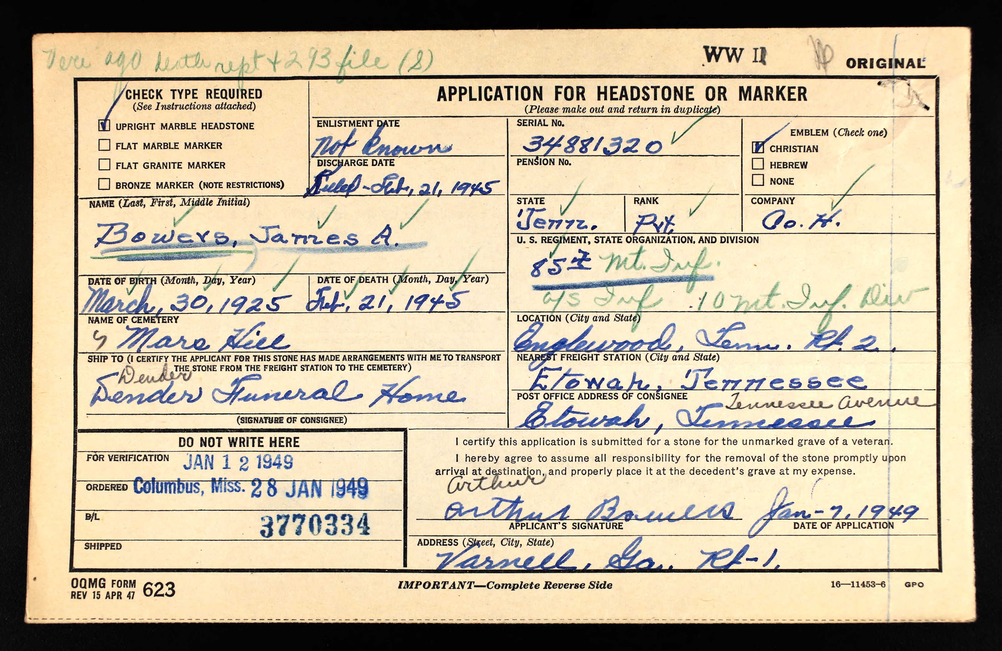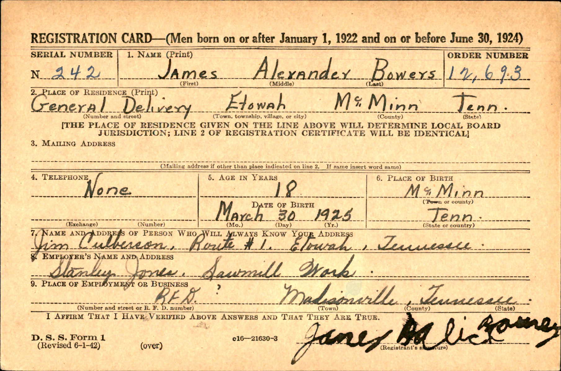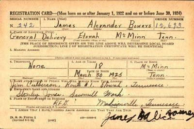 James Alexander “Alex” Bowers was born 30 March 1925, the son of Jacob Arthur Bowers and Isabelle Patterson.