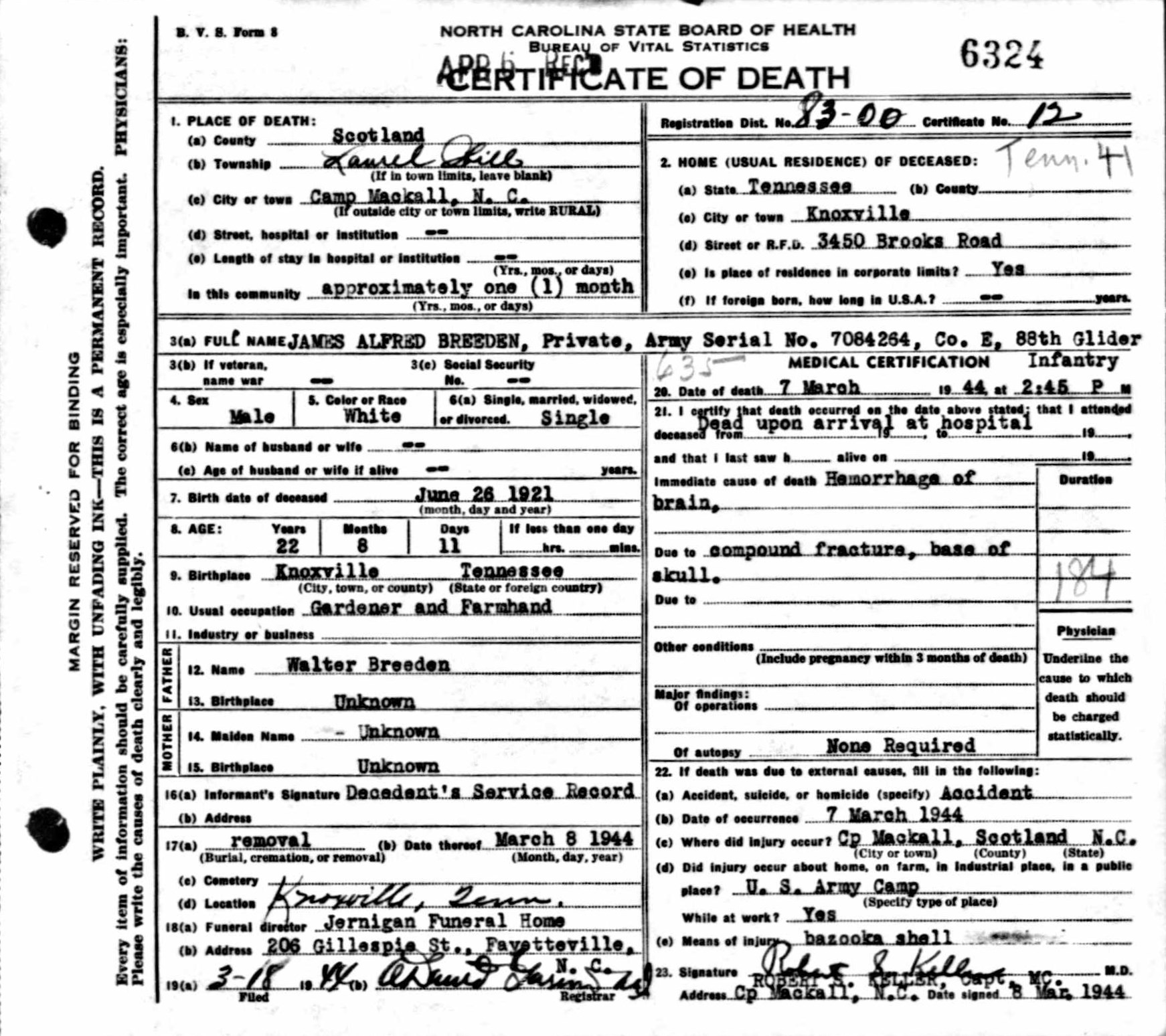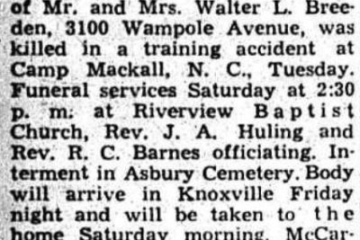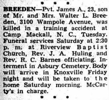 Pvt. James A. Breeden, 23, son of Mr. and Mrs. Walter L. Breeden, 3100 Wampole Avenue, was killed in a training accident at Camp Mackall, N.C., Tuesday. Funeral services at Riverview Baptist Church. Interment in Asbury Cemetery. Body will arrive in Knoxville Friday night and will be taken to the home Saturday morning.