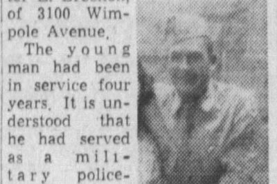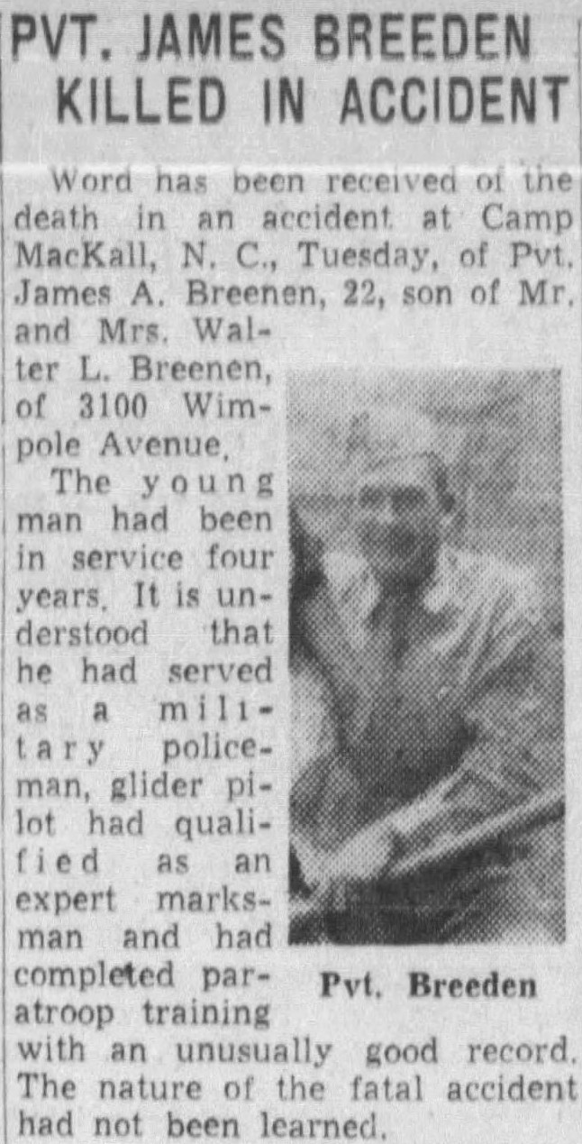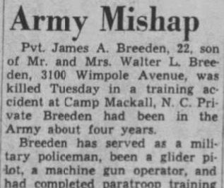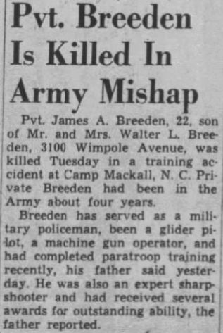 Pvt. James A. Breeden, 22, son of Mr. and Mrs. Walter L. Breeden, 3100 Wimpole Avenue, was killed in a training accident at Camp Mackall, N.C. Private Breeden had been in the Army about four years. Breeden has served as a military policeman, been a glider pilot, a machine gun operator and had completed paratroop training recently, his father said yesterday. He was also an expert sharpshooter and had received several awards for outstanding ability, the father reported.