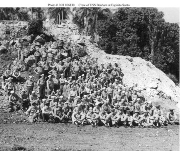 Benham then joined TF 64 on 15 October 1942 as a part of the naval covering force off Guadalcanal. During 14–15 November, she took part in the Battle of Guadalcanal and at 0038 hours (12:38am) on 15 November she took a single torpedo to her starboard (right side) bow that severed everything forward of her bridge. The explosion also sent up a great column of water that cascaded down the ship washing one sailor overboard. The Benham was able to stay afloat and slowly started making her way towards Guadalcanal with the USS Gwin (DD-433) watching over her. By 1637 hours (4:37pm) further progress was impossible and her crew was ordered to abandoned ship after she started to split in half from the rough seas. James and the other survivors were picked up by Gwin and afterwards the Gwin sank the two sections at 1938 hours (7:38pm) by shell-fire. The sailor that was washed overboard was rescued by the USS Meade (DD-602), so the entire crew of the Benham survived the attack and sinking.