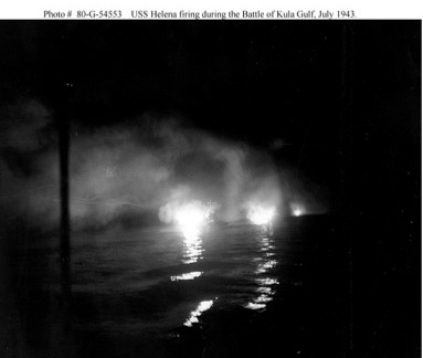 By midnight on 5 July 1943, Helena’s group was off the northwest corner of New Georgia a group that included three cruisers and four destroyers. Racing down the slot to face them were three groups of Japanese destroyers, totaling ten enemy ships. Four of them peeled off to accomplish their mission of landing their troops in a counter-attack against our Marines. By 0157 hours (1:57am) on 6 July the Helena began blasting away, but she had expended all her flashless powder and was using smokeless powder that produced immense flames when fired, this made her a perfect target at night.