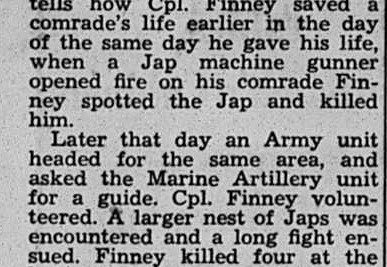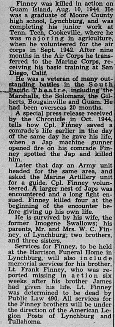 He is survived by his wife, the former Miss Imogene Swallows, daughter of Mr. and Mrs. A.A. Swallows; his parents, Mr. and Mrs. W.C. Finney of Lynchburg; three brothers, one of whom Frank, is stationed with the U.S. Army in India; and three sisters. A recent press release sent the Chronicle gave the details of his last mission, and told of how he saved the life of a Marine officer on the mission immediately previous to that in which he gave his life.